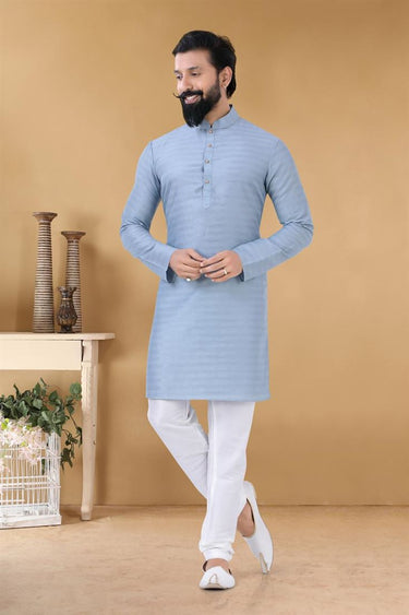 Fetching Blue Color Cotton Fabric Wedding Wear Designer Readymade Kurta Pyjama For Men