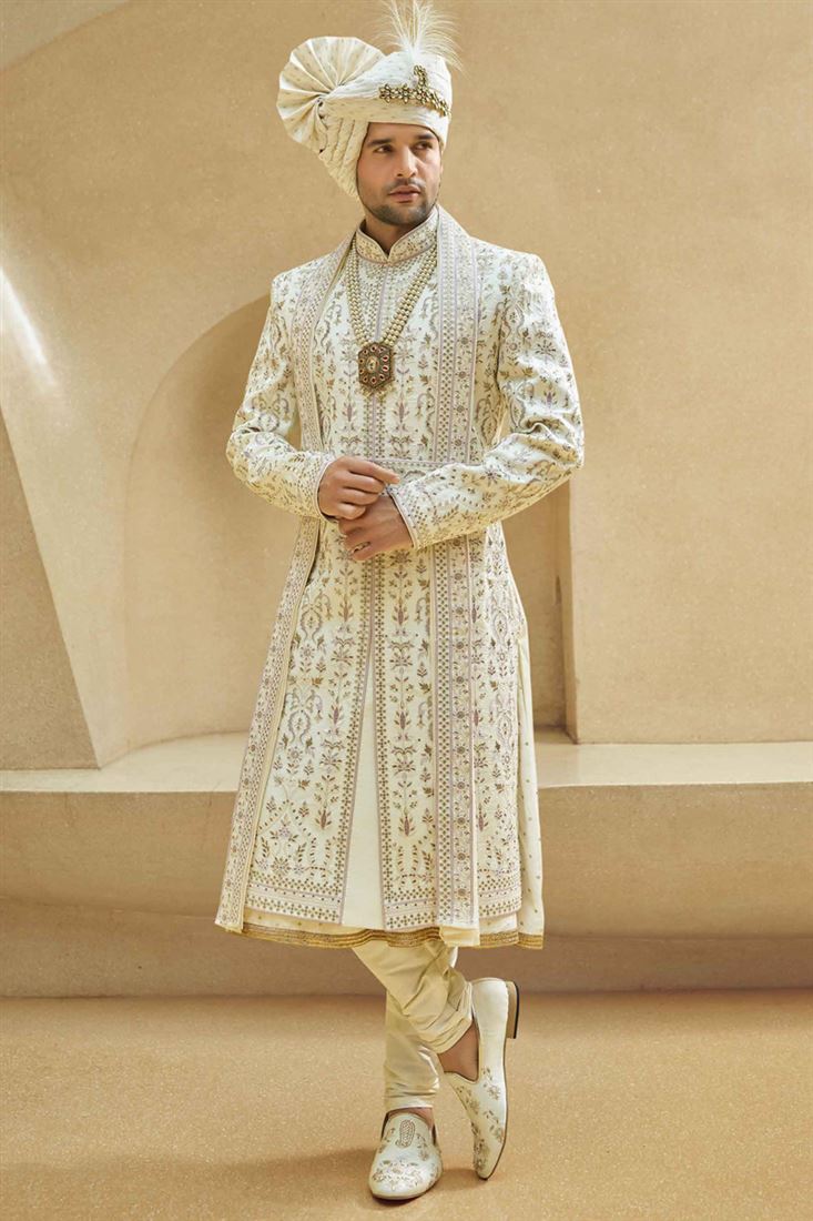 Fetching Off White Color Fancy Fabric Heavy Embroidered Designer Indowestern Groom Sherwani