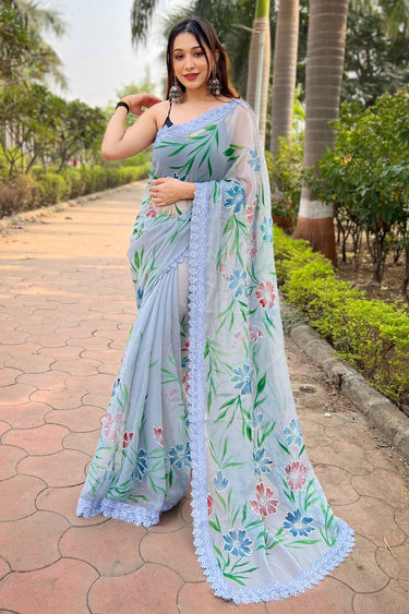 Floral Print Fancy Fabric Casual Saree In Grey Color