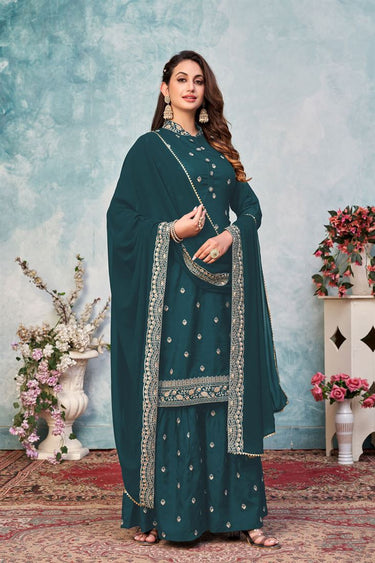 Function Wear Art Silk Fabric Palazzo Suit In Teal Color