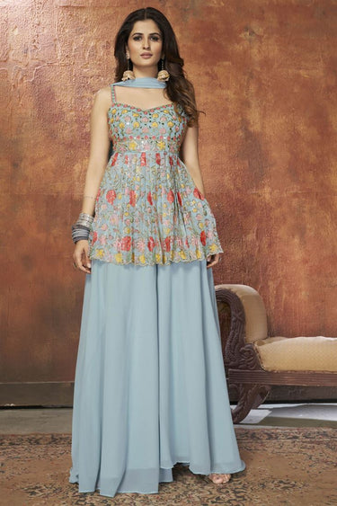 Function Wear Georgette Fabric Sequins Work Sky Blue Color Palazzo Suit