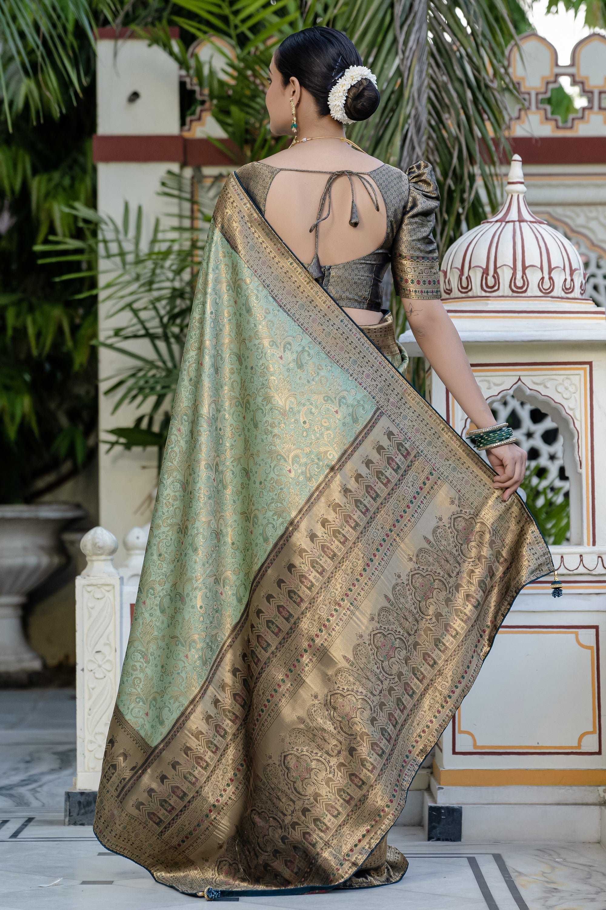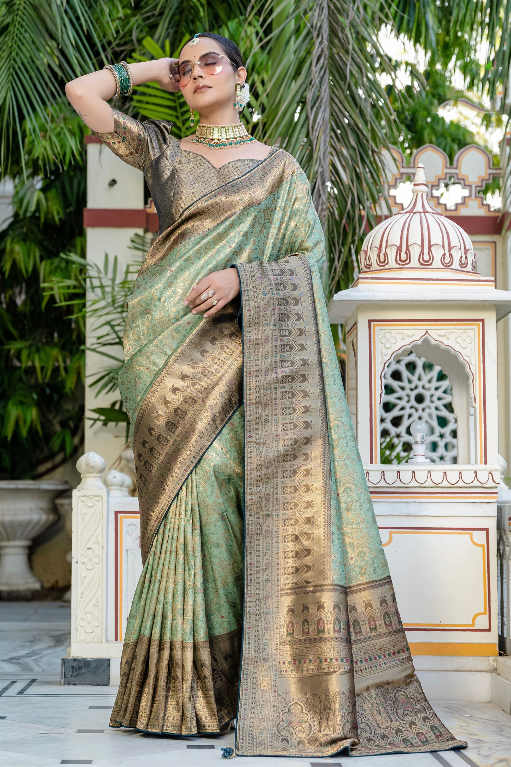 Function Wear Kanjivaram Silk Zari Weaving Work Saree In Sea Green Color