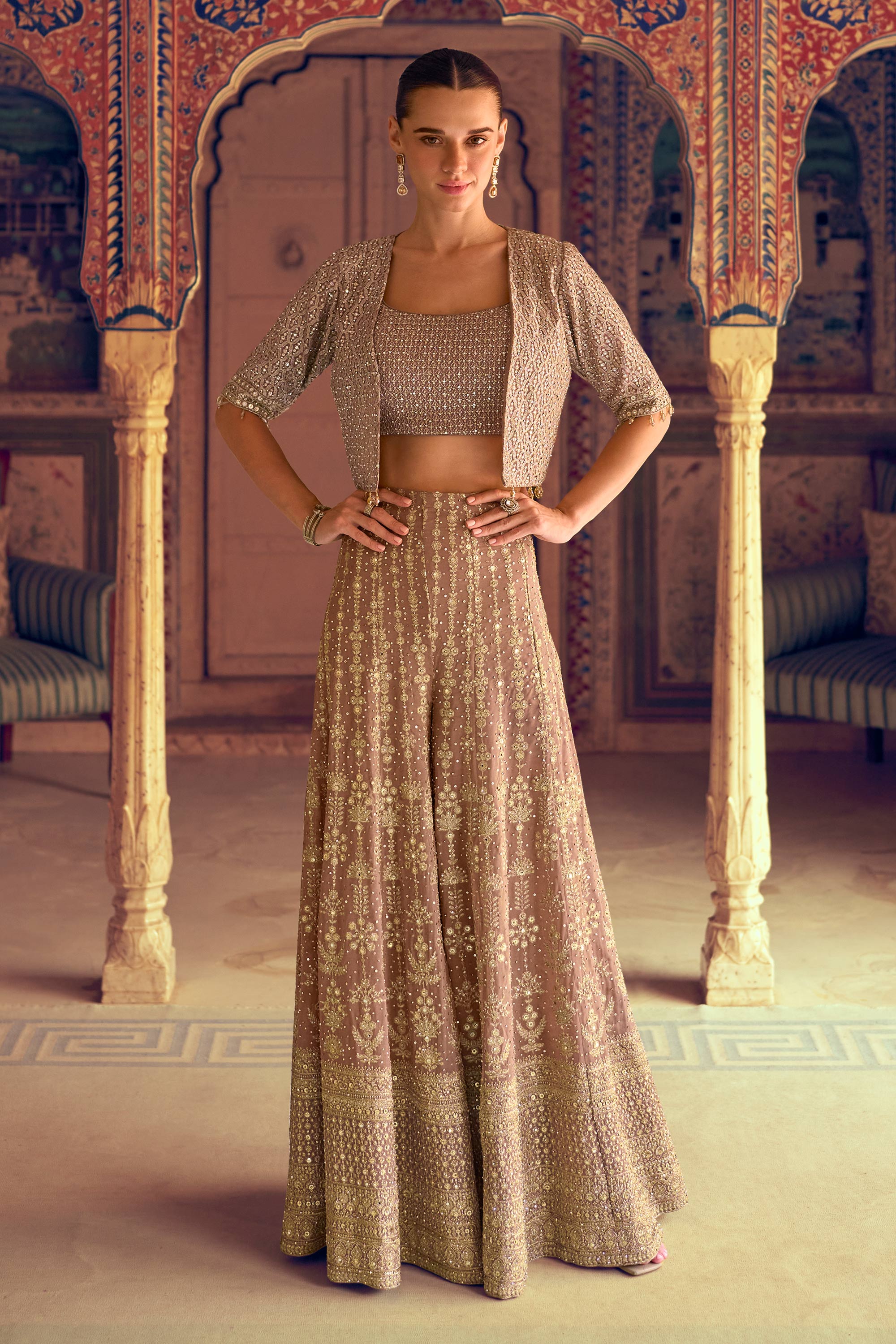 Georgette Embroidered Pink Readymade Indo Western Palazzo Set With Jacket For Party Wear