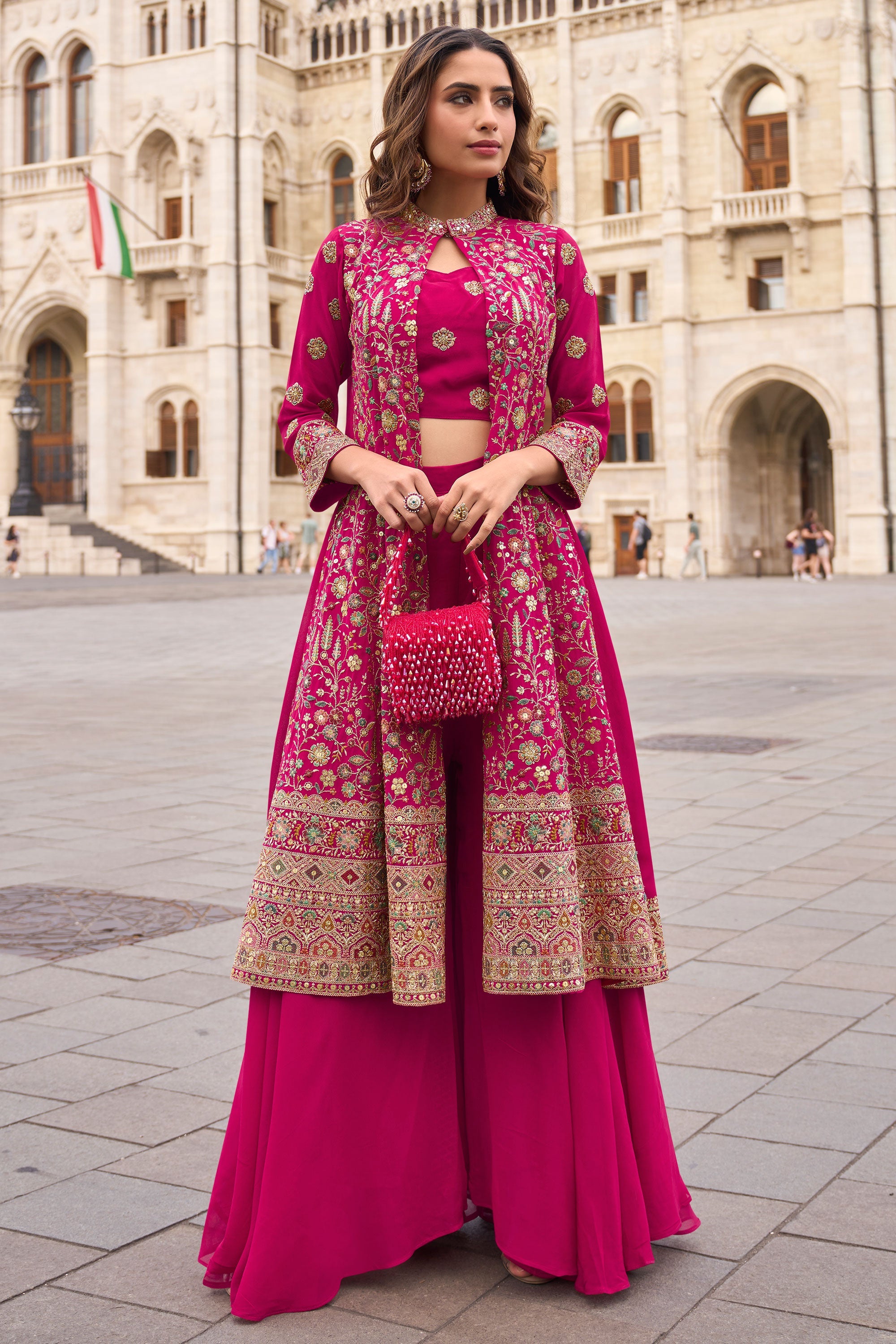 Georgette Embroidered Rani Designer Indo Western Crop Top With Palazzo