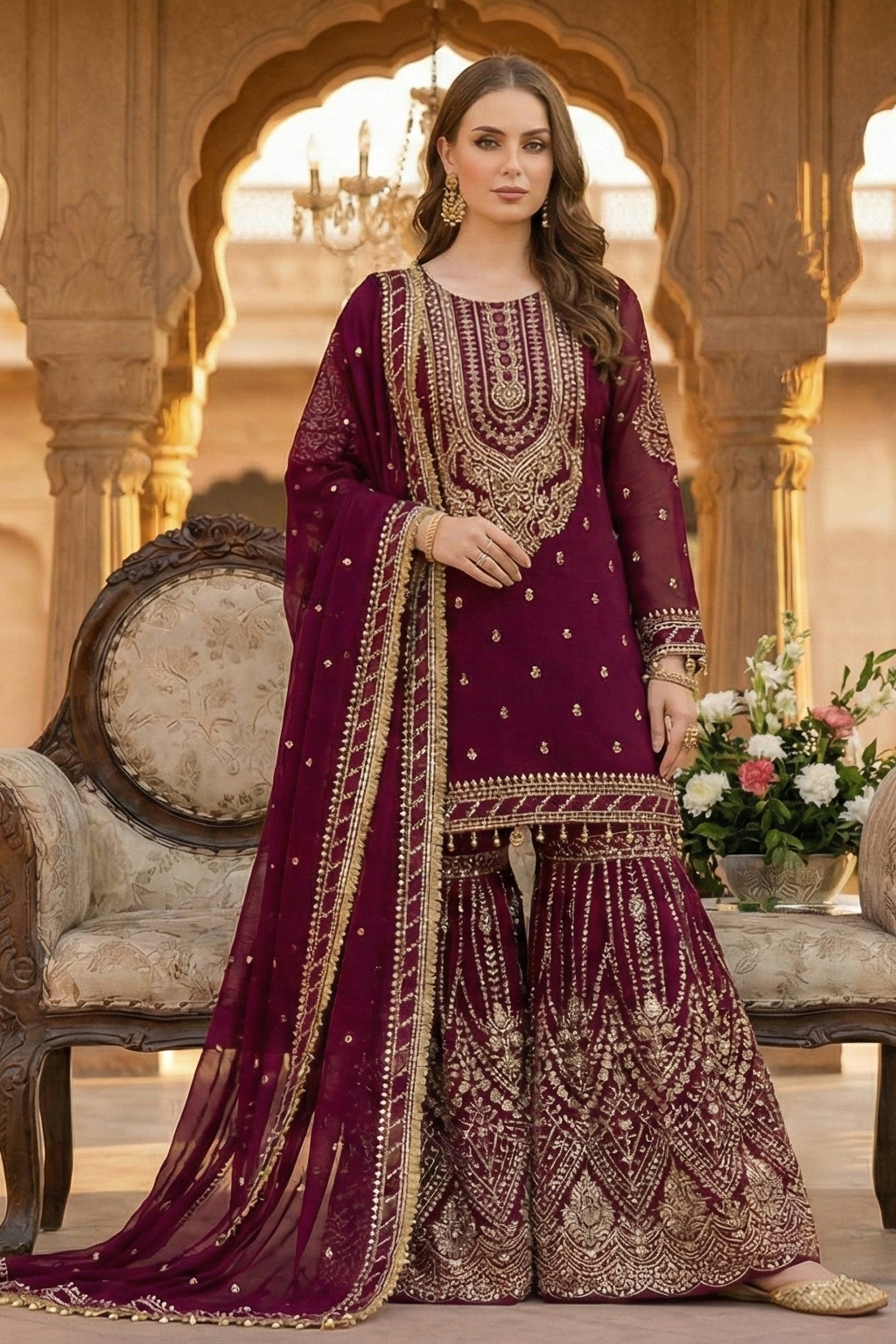 Georgette Embroidered Wine Festive Wear Readymade Palazzo Suit With Dupatta