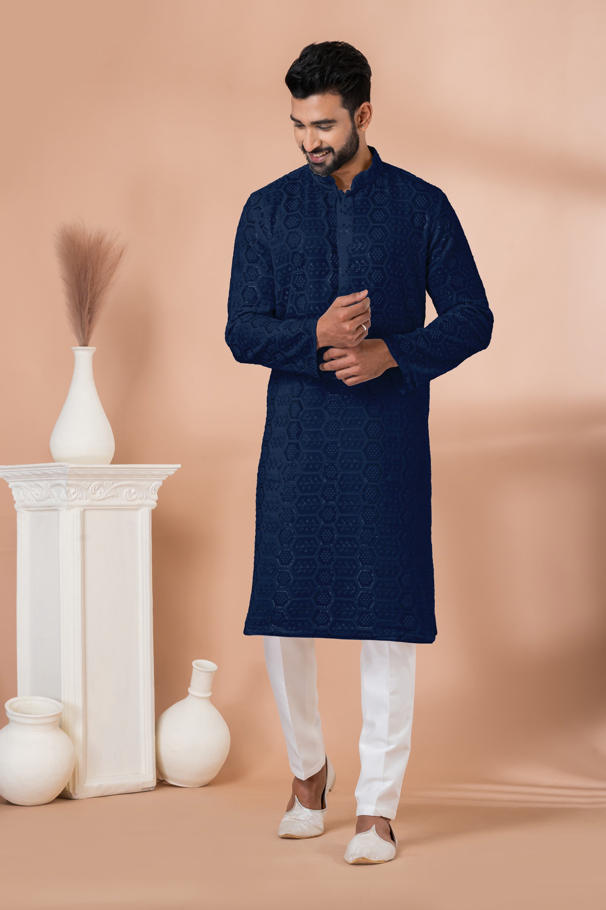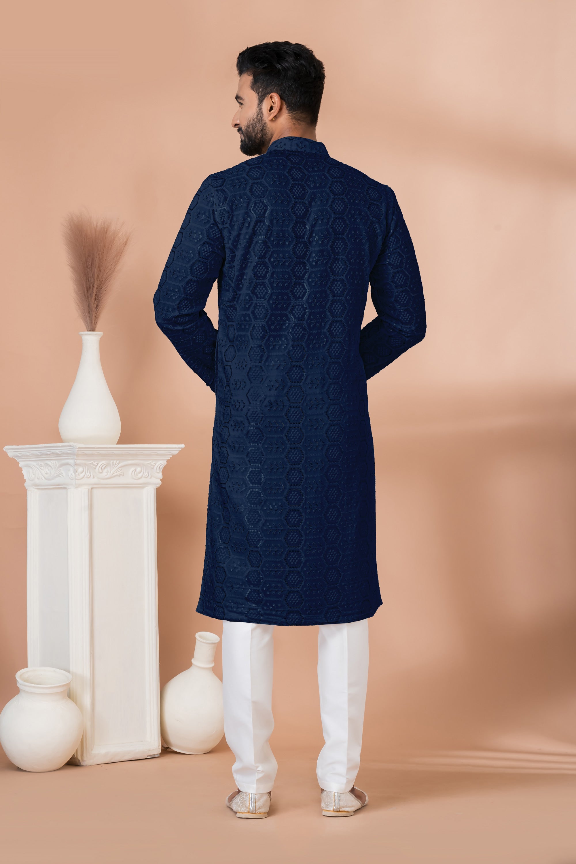 Georgette Fabric Artistic Sequins Embroidery Navy Blue Color Readymade Men Kurta Pyjama For Wedding Wear