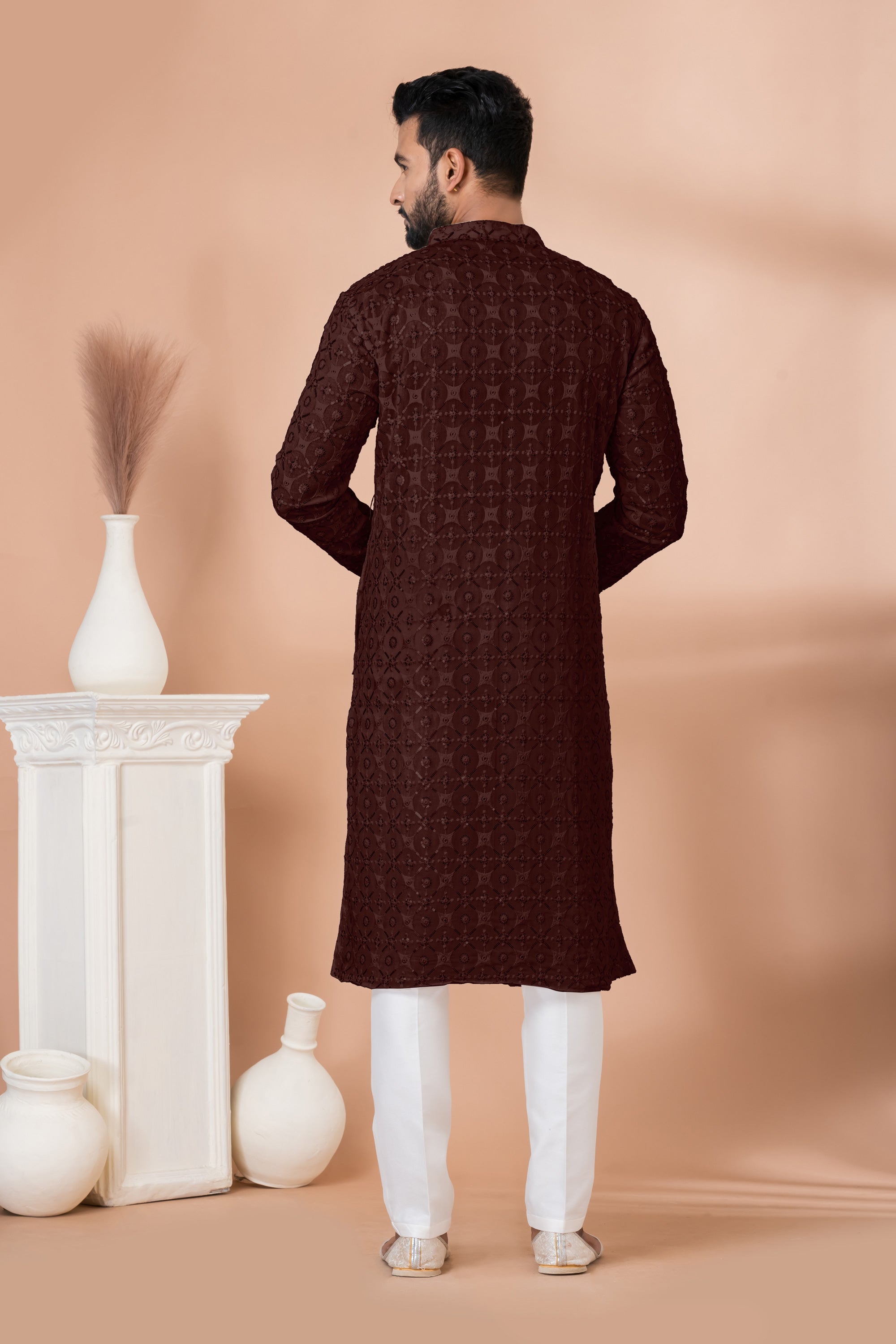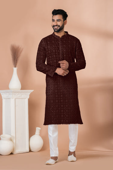 Georgette Fabric Brown Color Trendy Readymade Men Kurta Pyjama