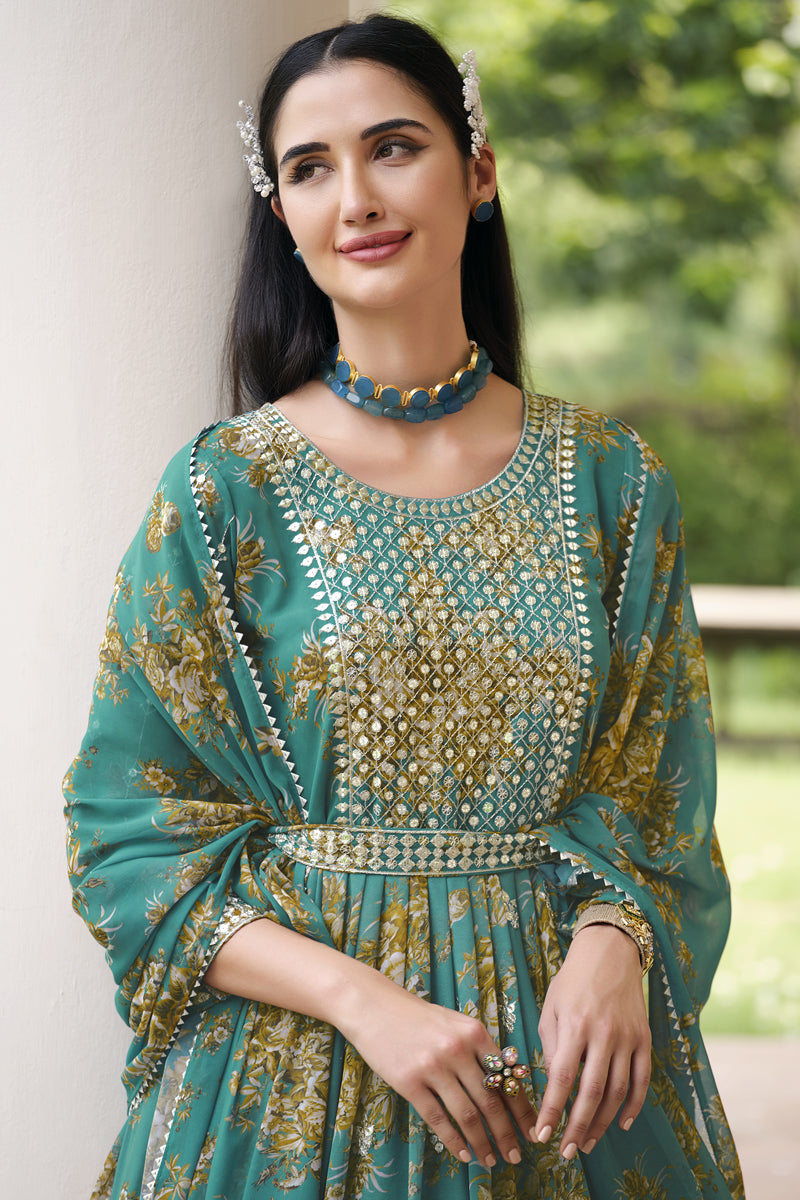 Georgette Fabric Cyan Color Festive Wear Printed Readymade Anarkali Salwar Kameez