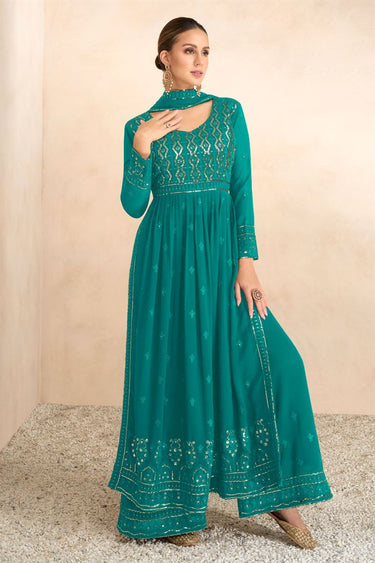 Georgette Fabric Dark Cyan Color Sequins Work Winsome Palazzo Suit