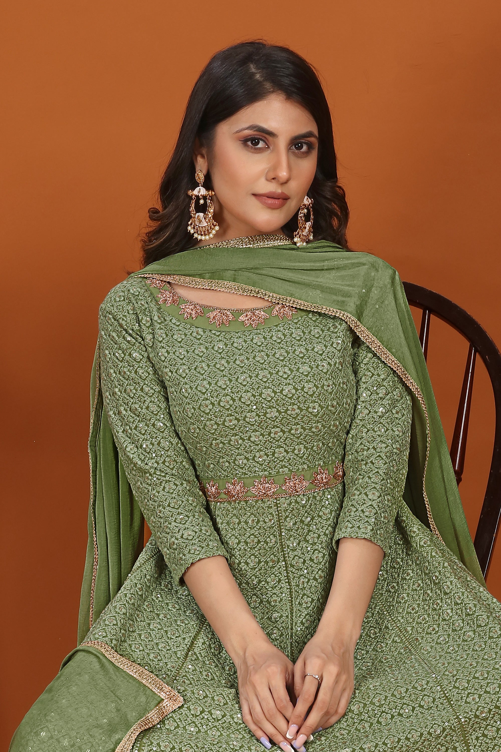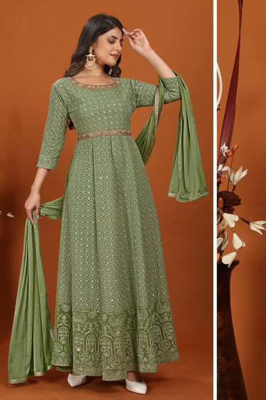 Georgette Fabric Embroidered Work Glamorous Gown With Dupatta In Sea Green Color