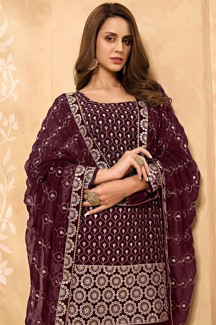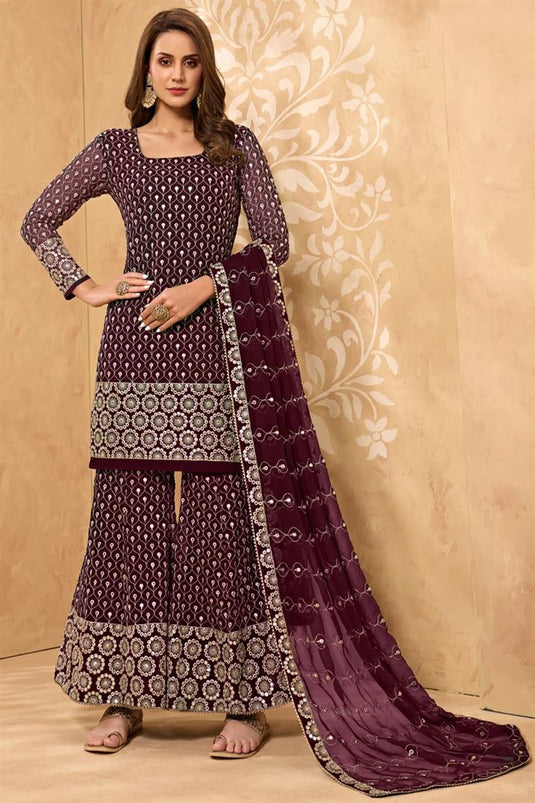 Georgette Fabric Festive Wear Embroidered Maroon Color Sharara Suit