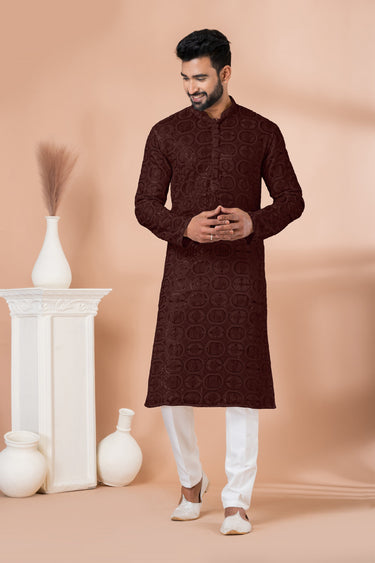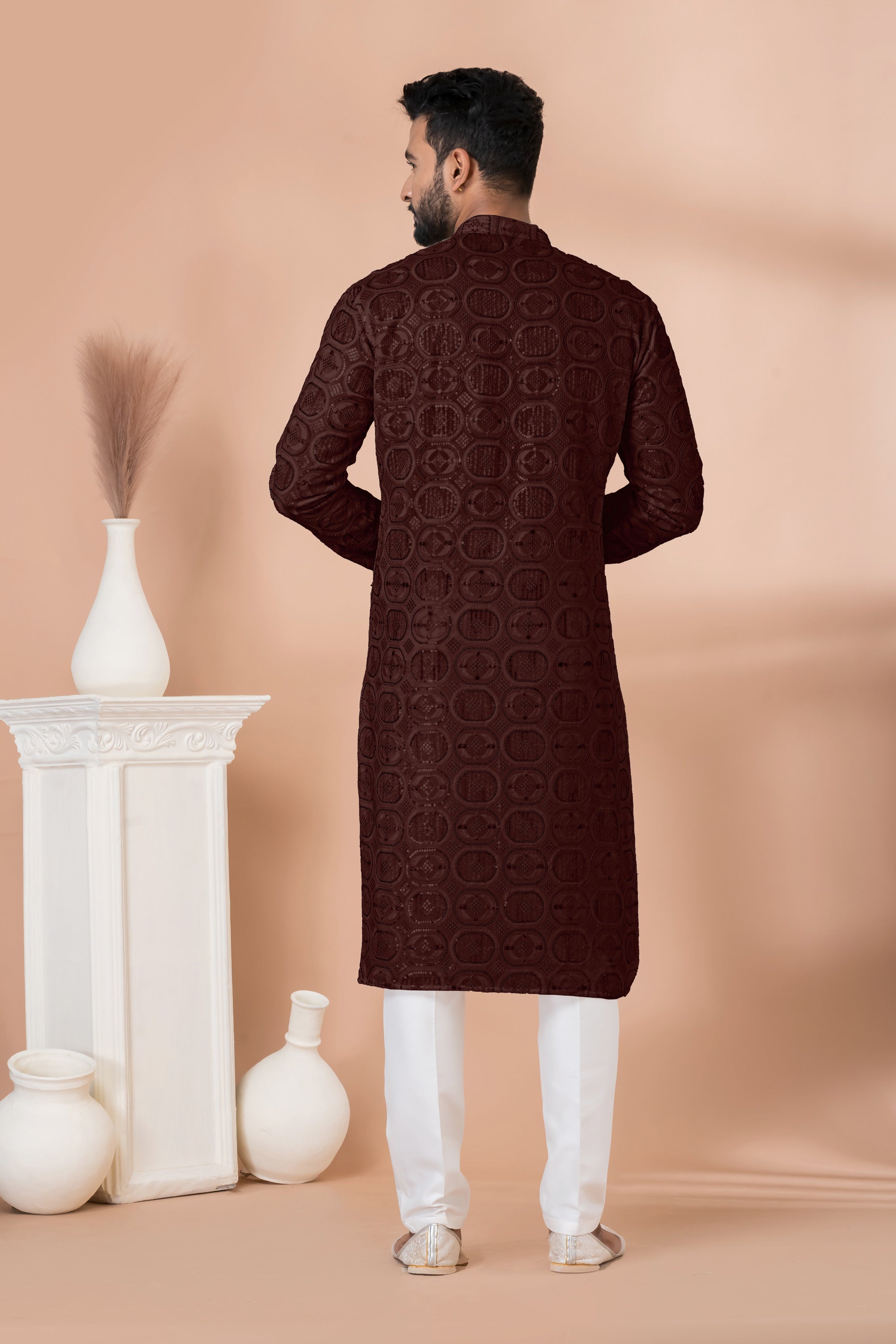 Georgette Fabric Lovely Brown Color Festive Wear Sequins Embroidery Readymade Kurta Pyjama For Men