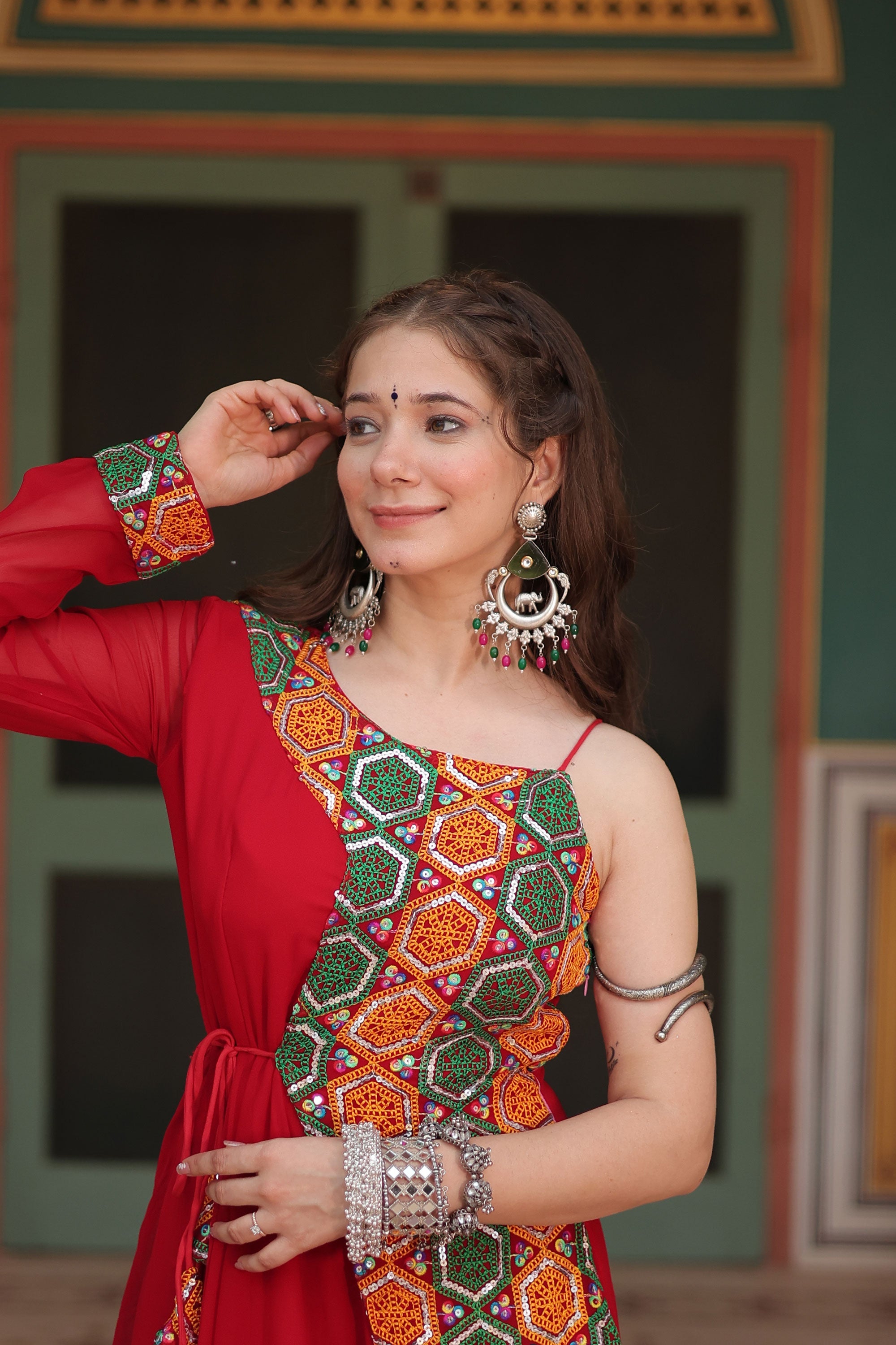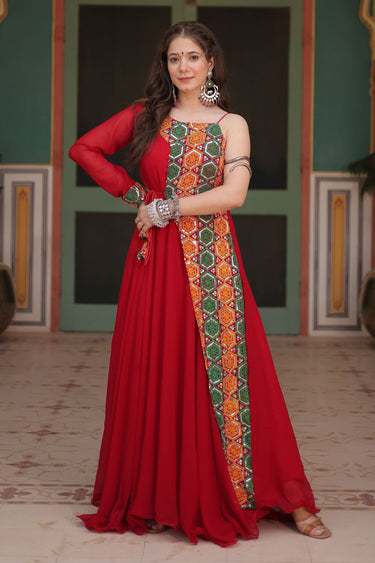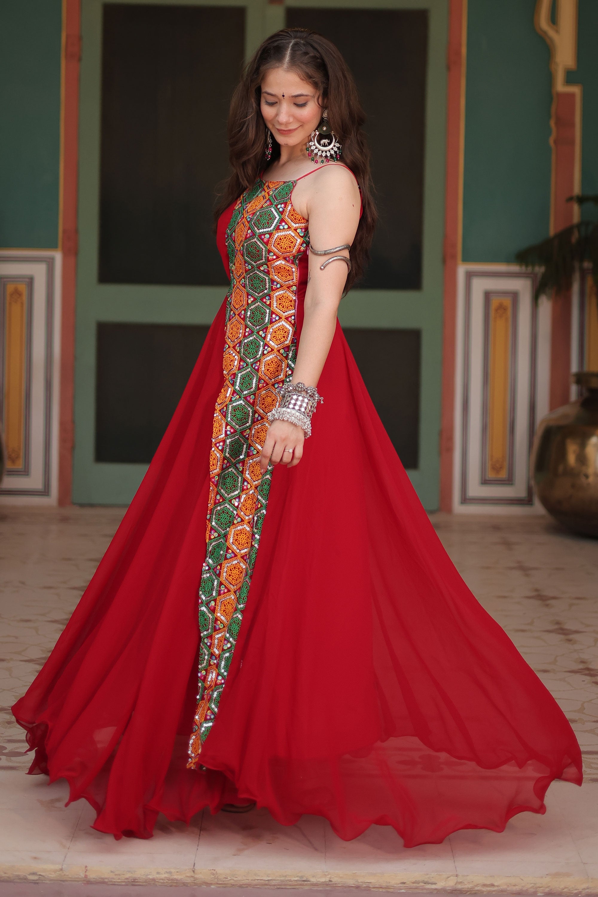 Georgette Fabric Magnificent Readymade Red Color Gown With Fancy Work