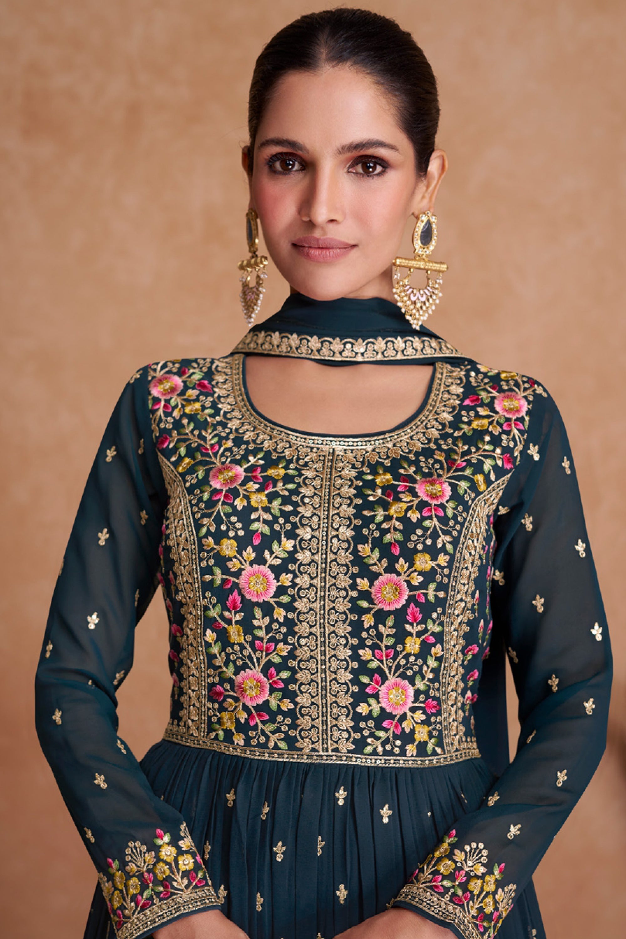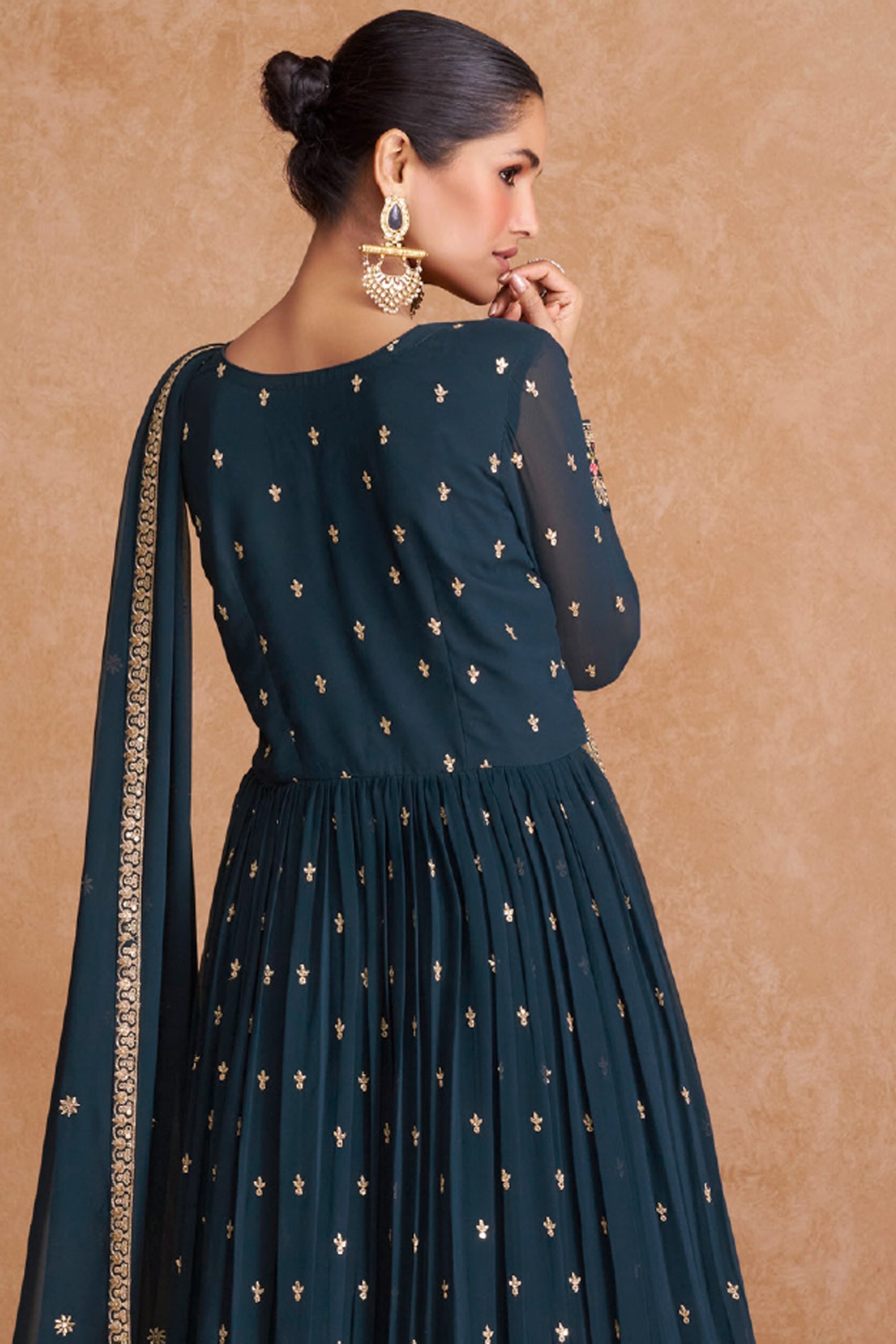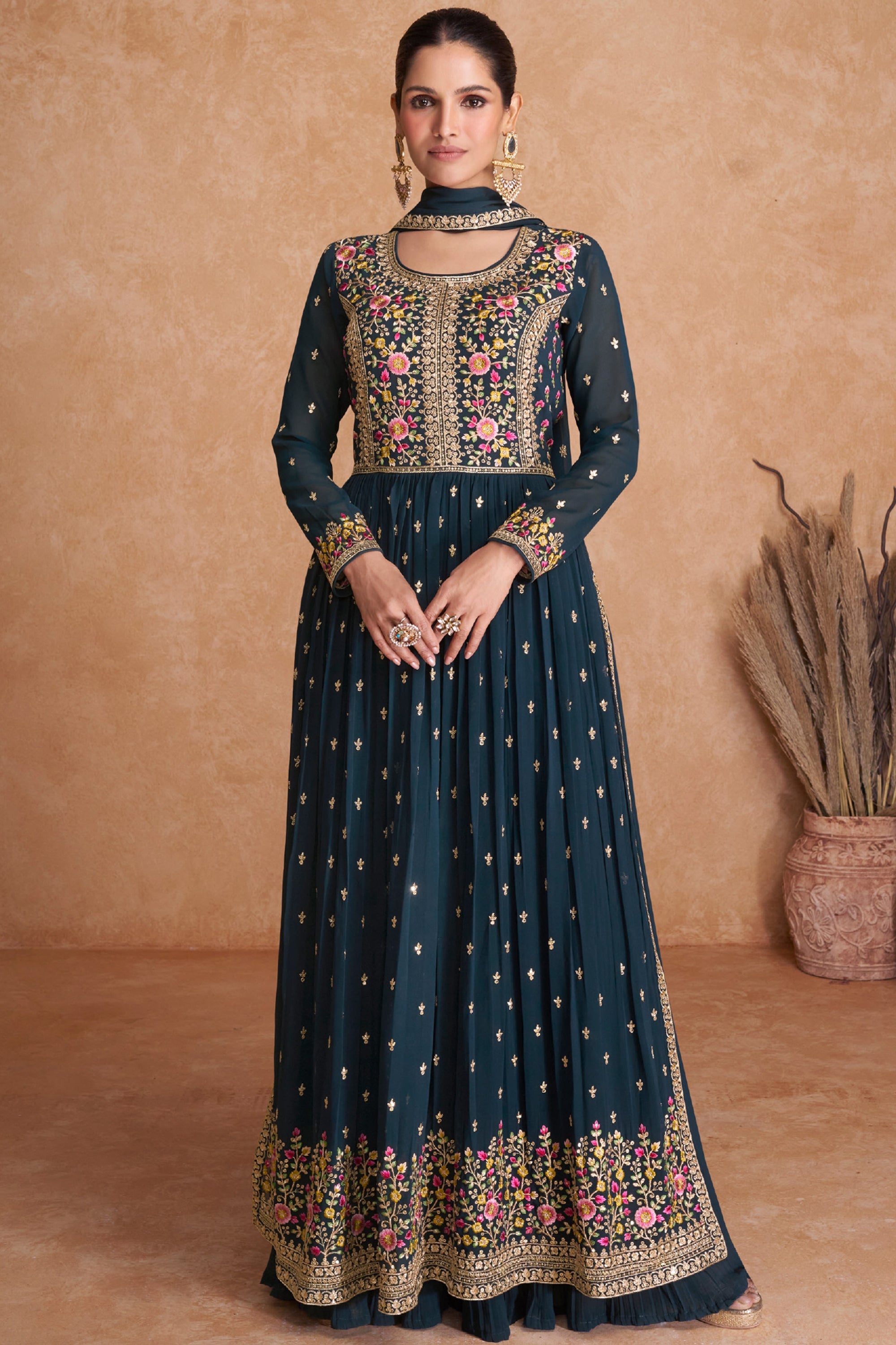 Georgette Fabric Navy Blue Color Festive Wear Embroidered Readymade Designer Long Anarkali Salwar Kameez