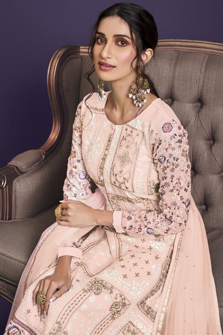 Georgette Fabric Party Wear Peach Color Embroidered Designer Salwar Suit