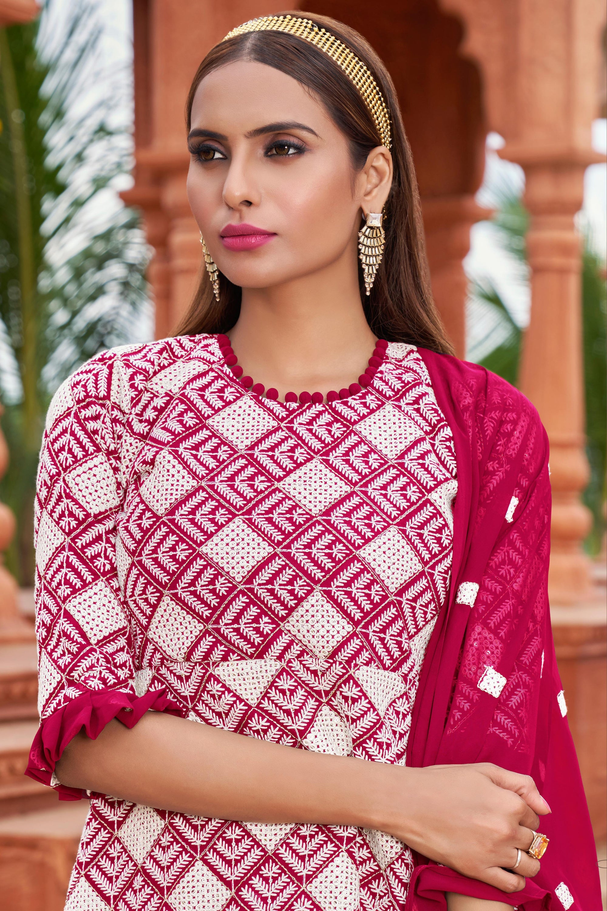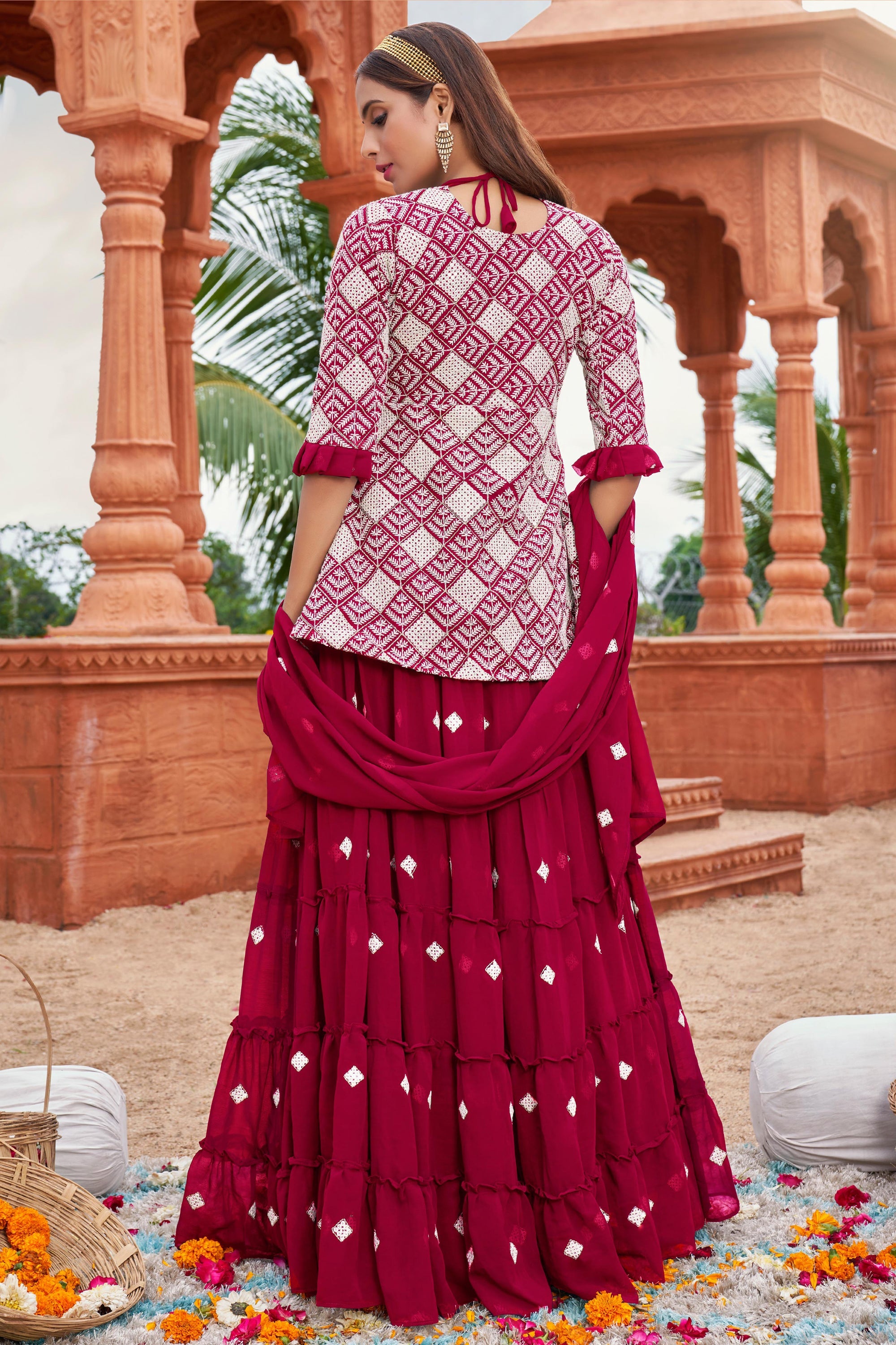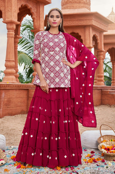 Georgette Fabric Pink Designer 3 Piece Embroidered Readymade Sharara Top Lehenga