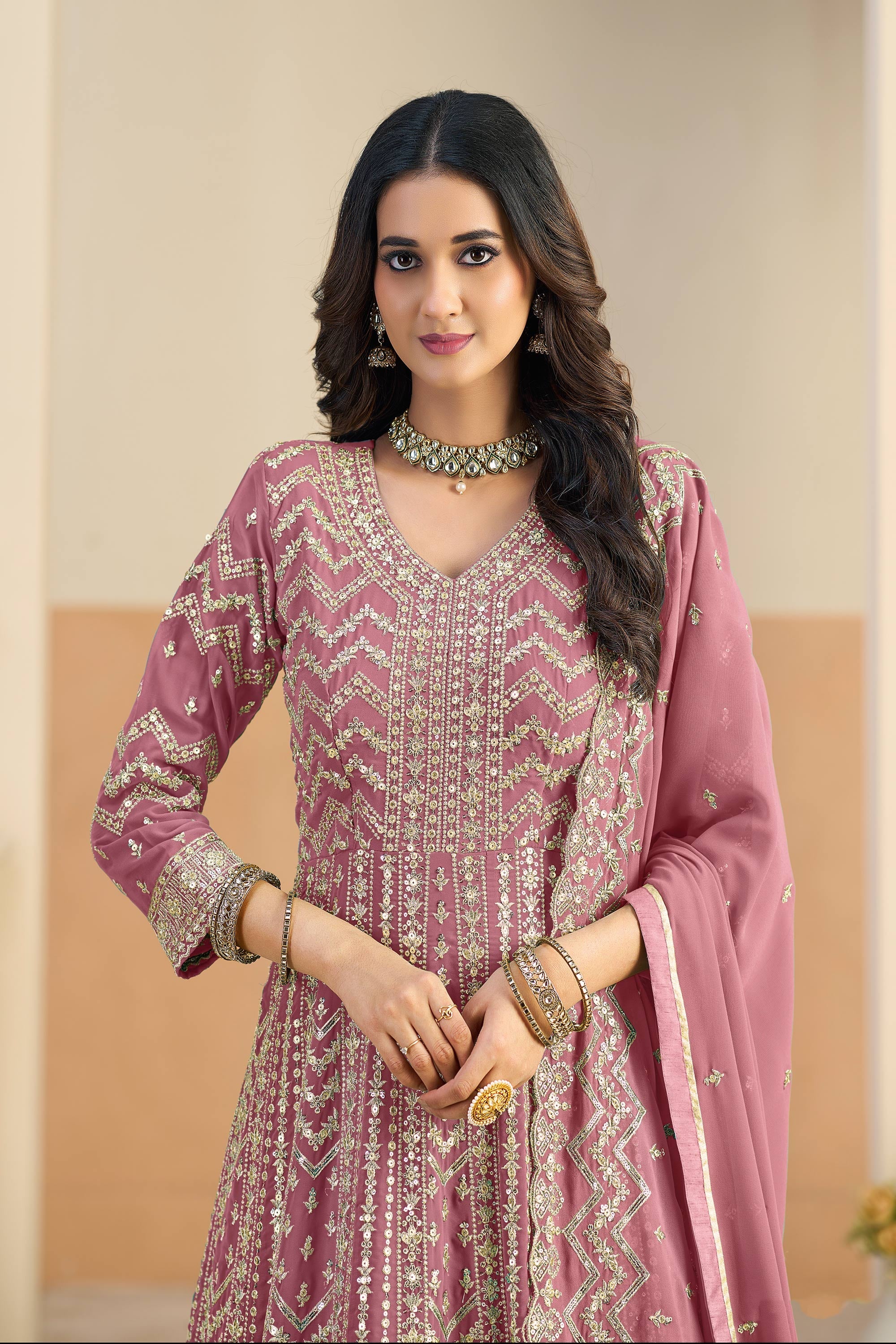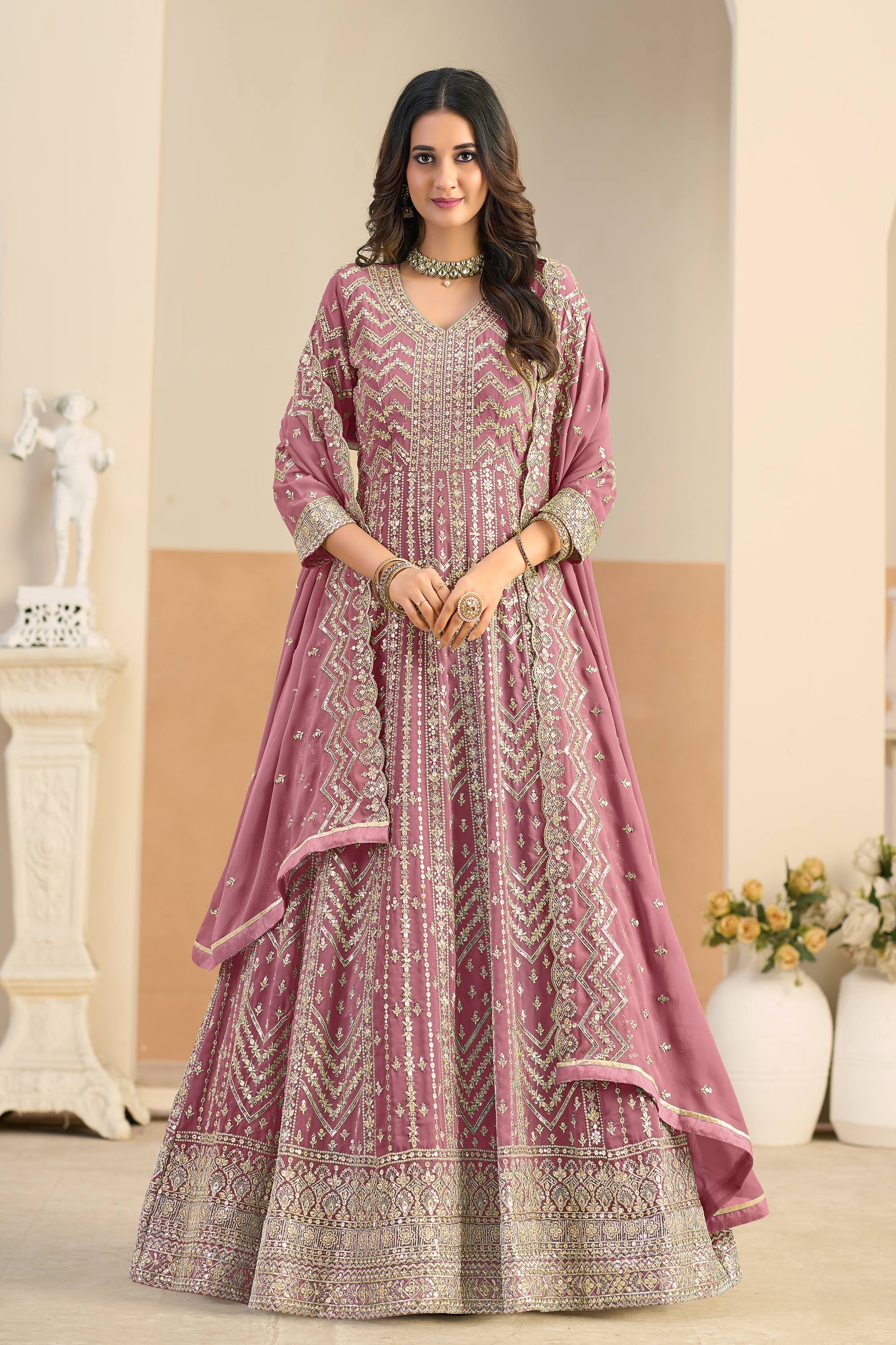 Georgette Fabric Pink Festive Wear Readymade Anarkali Suit