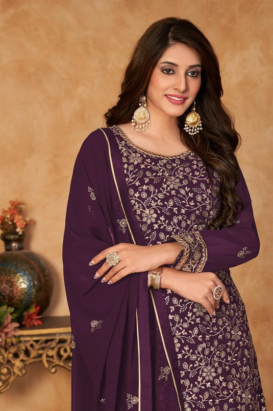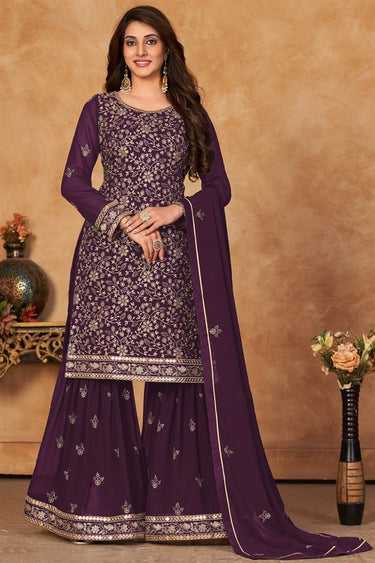 Georgette Fabric Purple Color Sangeet Wear Soothing Sharara Suit