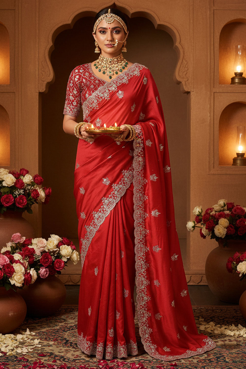 Celebrate the auspicious occasion of Karwa Chauth in style with this exquisite Georgette Satin Silk saree, designed to make every festive moment memorable. Featuring intricate Aari Embroidery, Dual Stone Embellishment, this saree exudes elegance and charm, perfectly suited for traditional celebrations. Its vibrant hues and delicate detailing make it a standout choice for festival gatherings, ensuring you shine with grace and sophistication. Please note, due to digital photography, slight color variations may occur, adding a unique touch to each piece. Embrace the festive spirit with this stunning Karwa Chauth saree and make every moment unforgettable.