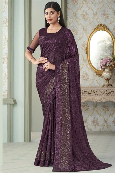Georgette Fabric Sequins Work Brilliant Saree In Wine Color
