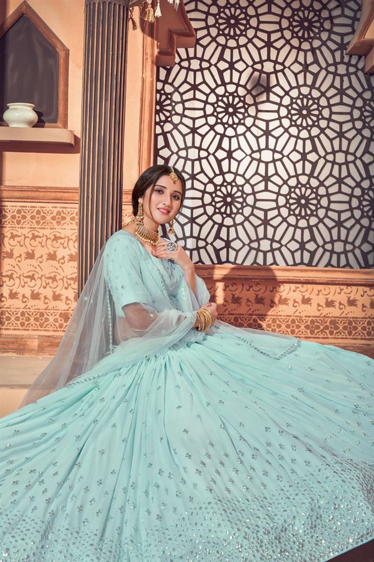 Georgette Fabric Wedding Wear Light Cyan Color Sequins Work Lehenga Choli