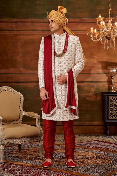 Georgette Off White Color Wedding Wear Readymade Designer Men Heavy Embroidered Groom Sherwani With Stole