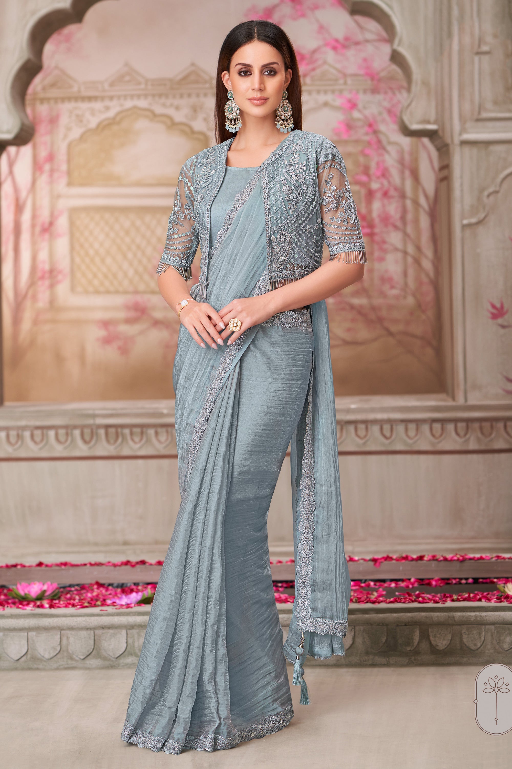 Georgette Party Style Lace Border Work Saree In Grey Color