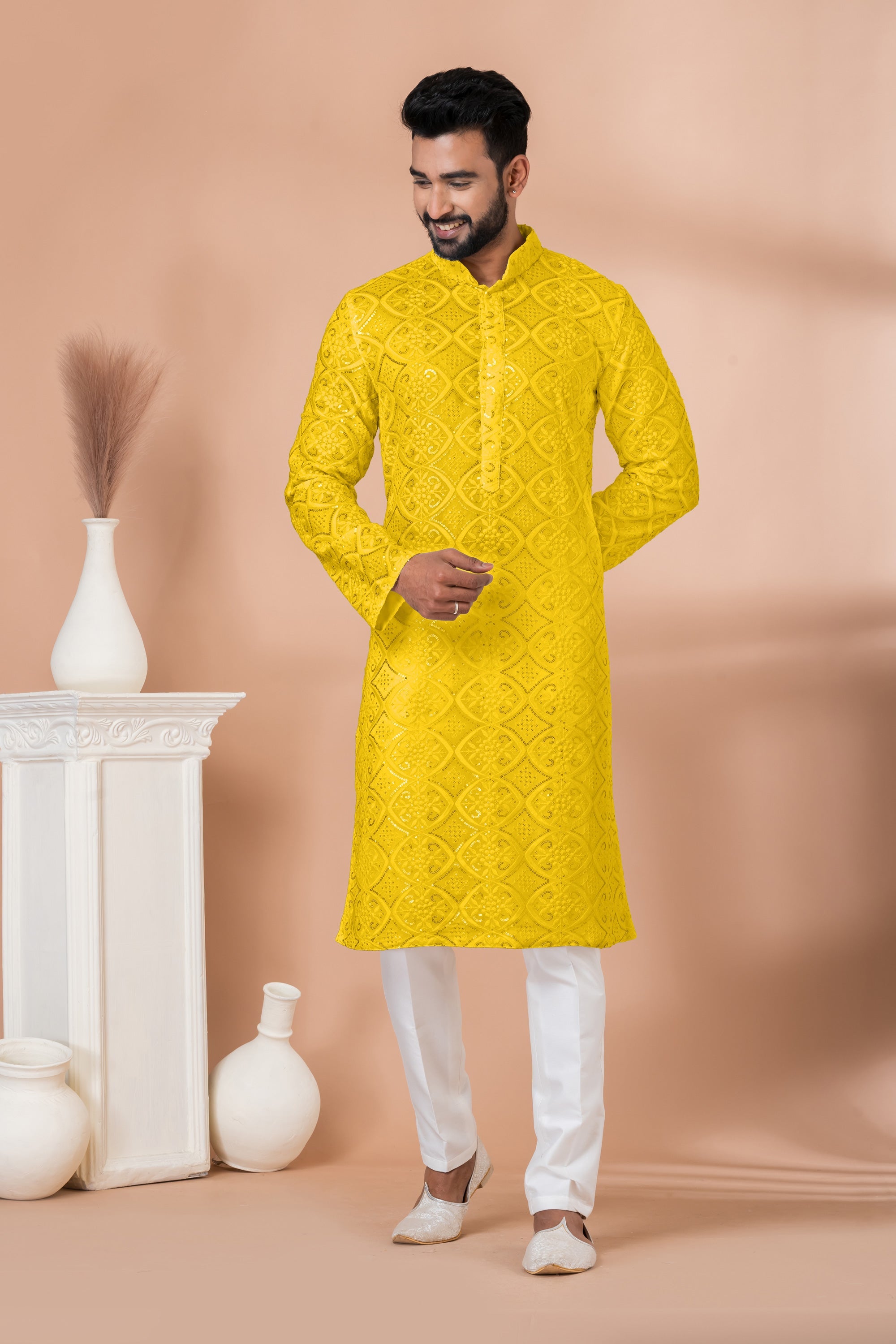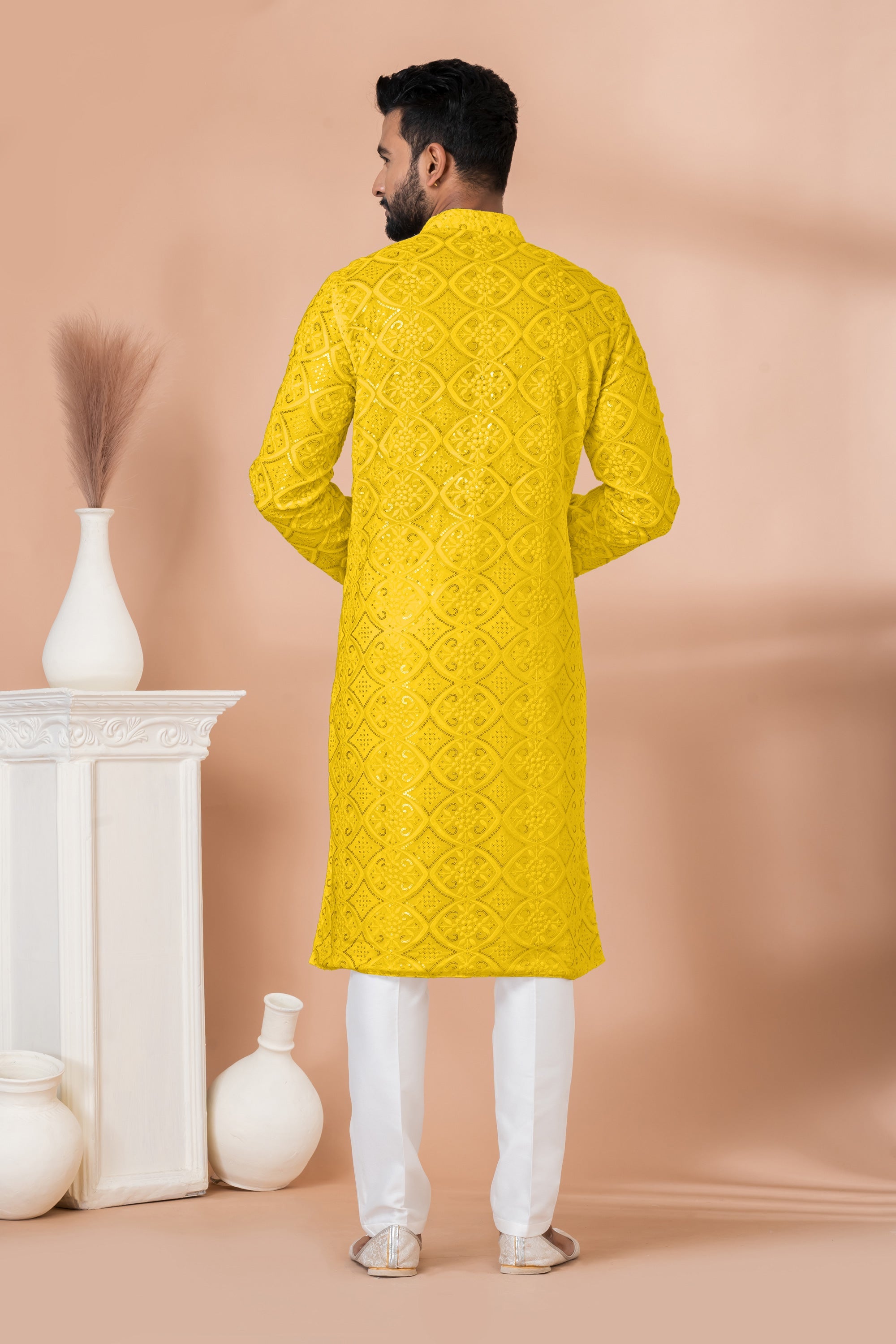 Georgette Sequins Embroidery Yellow Magnificent Readymade Men Kurta Pyjama For Sangeet Wear