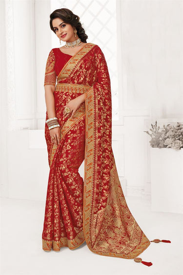 Make a statement and embrace the timeless beauty of our Georgette Embroidered Saree. Order yours today and experience the joy of wearing a truly remarkable piece of art. Add a touch of Red Color to your wardrobe and let your style shine through.