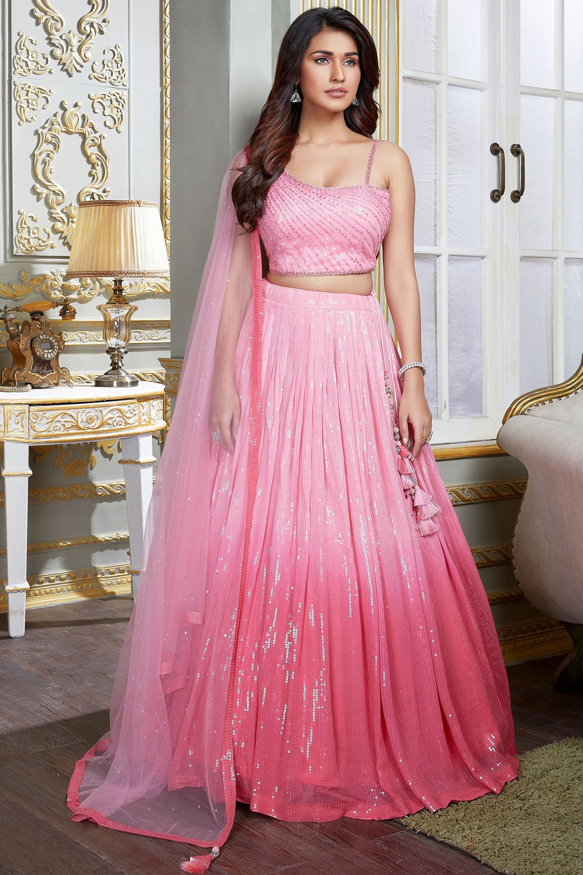 Elevate your style with this stunning sequin work Sangeet wear readymade lehenga. Made from georgette fabric, the beautiful flowing skirt and designer choli feature intricate detailing that will leave you feeling like a princess. The sparkling sequins add a touch of glamour while the georgette fabric provides comfort throughout any event. The matching designer choli complements the lehenga perfectly with its unique design, ensuring you'll look absolutely gorgeous from head to toe. This readymade outfit is perfect for those who are short on time but still want to make a statement at their next event. Don't miss out on the opportunity to be the belle of the ball!