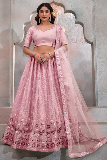 Glamorous Peach Color Function Style Net Fabric Lehenga