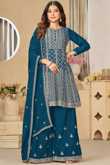 Glamorous Teal Color Embroidered Chinon Fabric Palazzo Suit