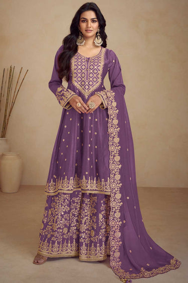 Glorious Function Wear Purple Color Chinon Fabric Palazzo Suit
