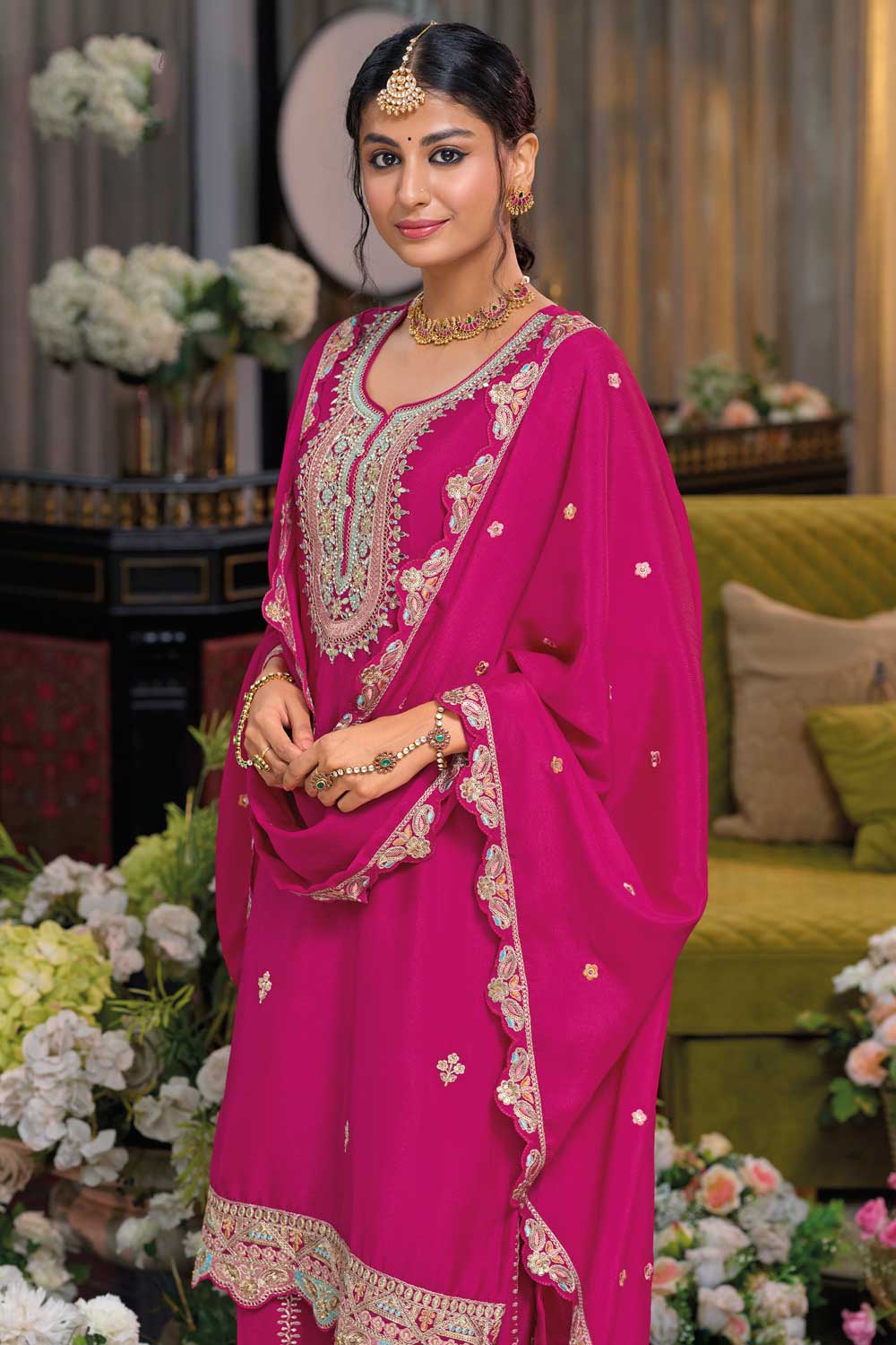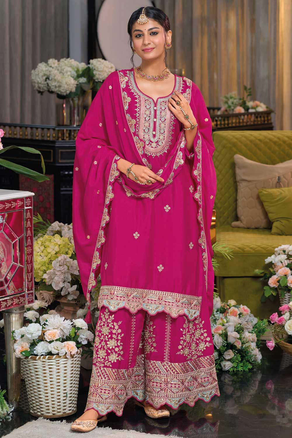 Elevate your festive wardrobe with this exquisite Palazzo Suit, crafted from luxurious Heavy Chinon fabric. Featuring intricate embroidery work, this readymade ensemble is designed to make you stand out on special occasions like Karva Chauth or any grand function. The outfit comes with a stylish top, flowing palazzo, and a matching dupatta, all in Heavy Chinon fabric, ensuring both comfort and elegance.,Top Length: Max up to 42.,Available Sizes: 38 to 44.,Perfect for embracing tradition with a modern twist, this suit is a must-have for your ethnic collection. Slight color variations may occur due to lighting conditions.