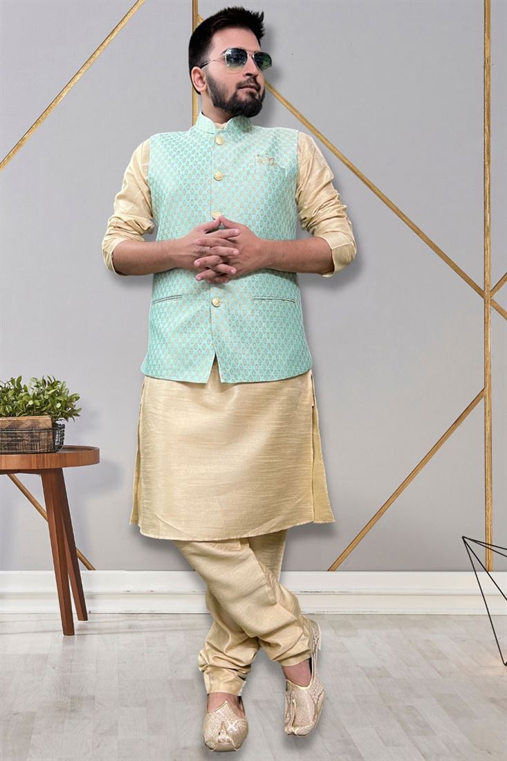 Gorgeous Art Silk Fabric Readymade Kurta Pyjama For Men With Sea Green Color 3 Pcs Jacket Set