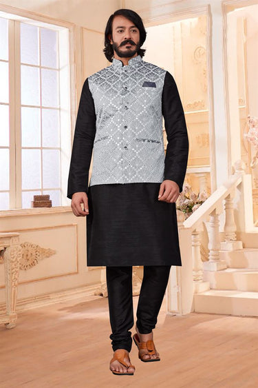 Gorgeous Black Color Art Silk Fabric Festive Wear Readymade Kurta Pyjama With Stylish Jacket