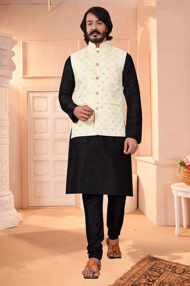 Gorgeous Black Color Art Silk Fabric Reception Wear Readymade Kurta Pyjama With Fancy Jacket