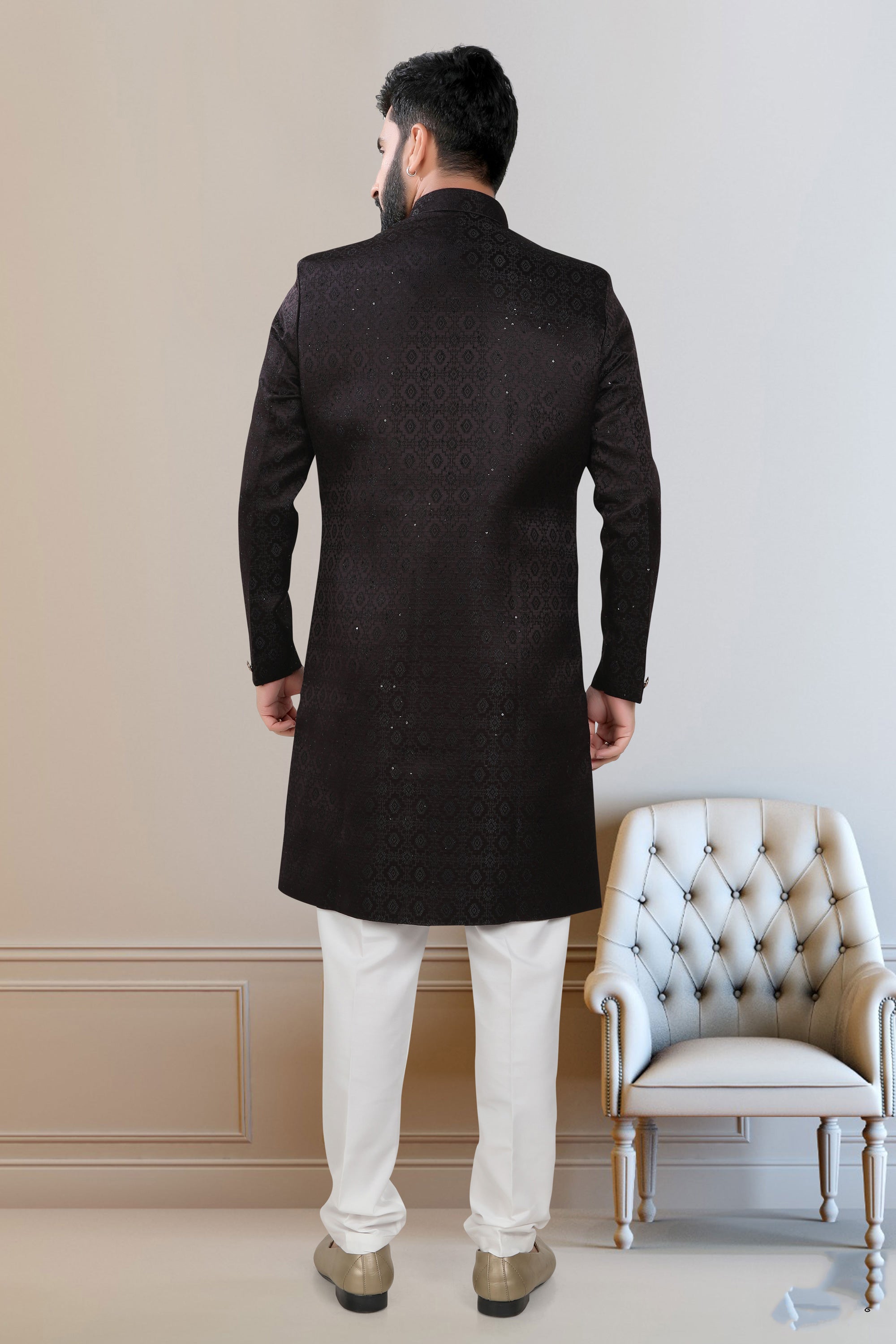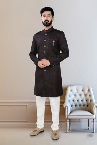Step into refined elegance with this magnificent Indo Western wedding outfit for men. Crafted from premium fancy fabric, this readymade ensemble is designed to offer maximum comfort and style. Its eye-catching color enhances your appearance, making you the center of attention at any event. Whether you are the groom or a special guest, this attire perfectly merges traditional and modern elements, delivering a distinctive look. With its superior tailoring and thoughtful design, you can confidently wear this piece knowing it exudes both grace and charm. Enhance your wardrobe with this impressive Indo Western wear.