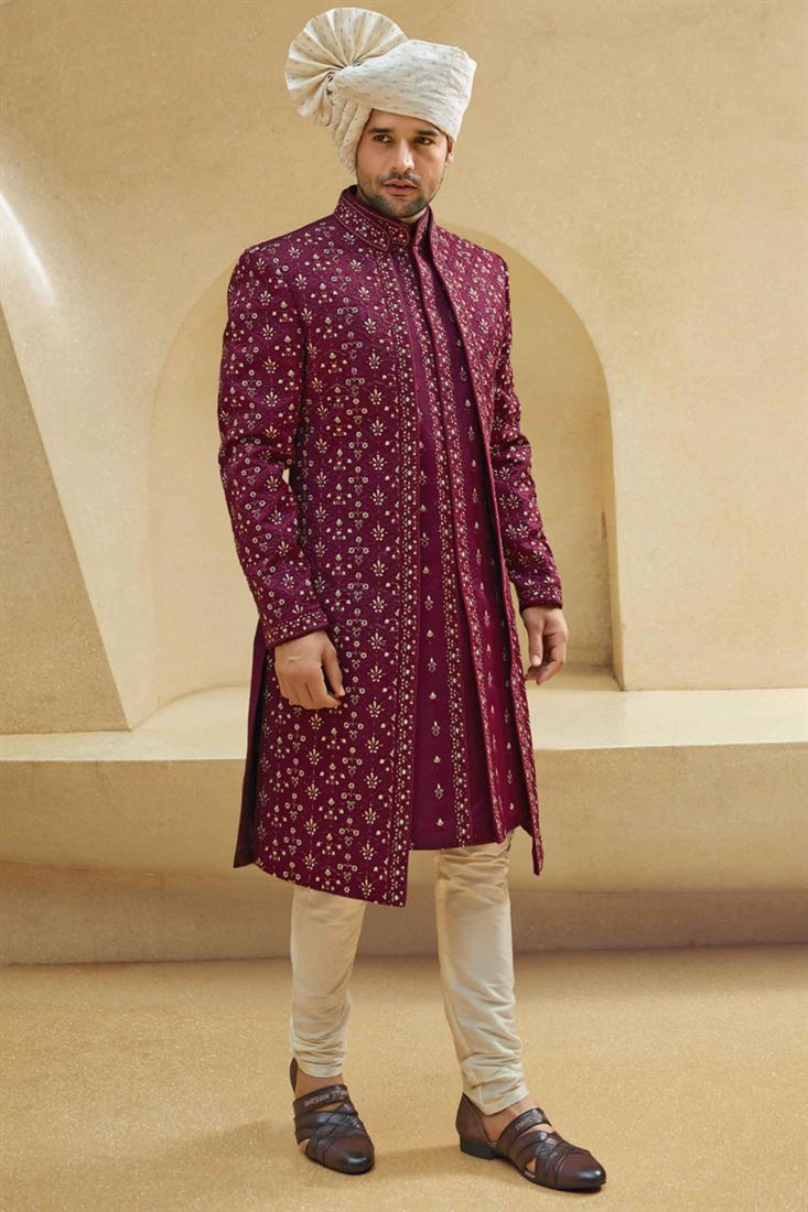 Gorgeous Burgundy Color Fancy Fabric Heavy Embroidered Designer Indowestern Groom Sherwani
