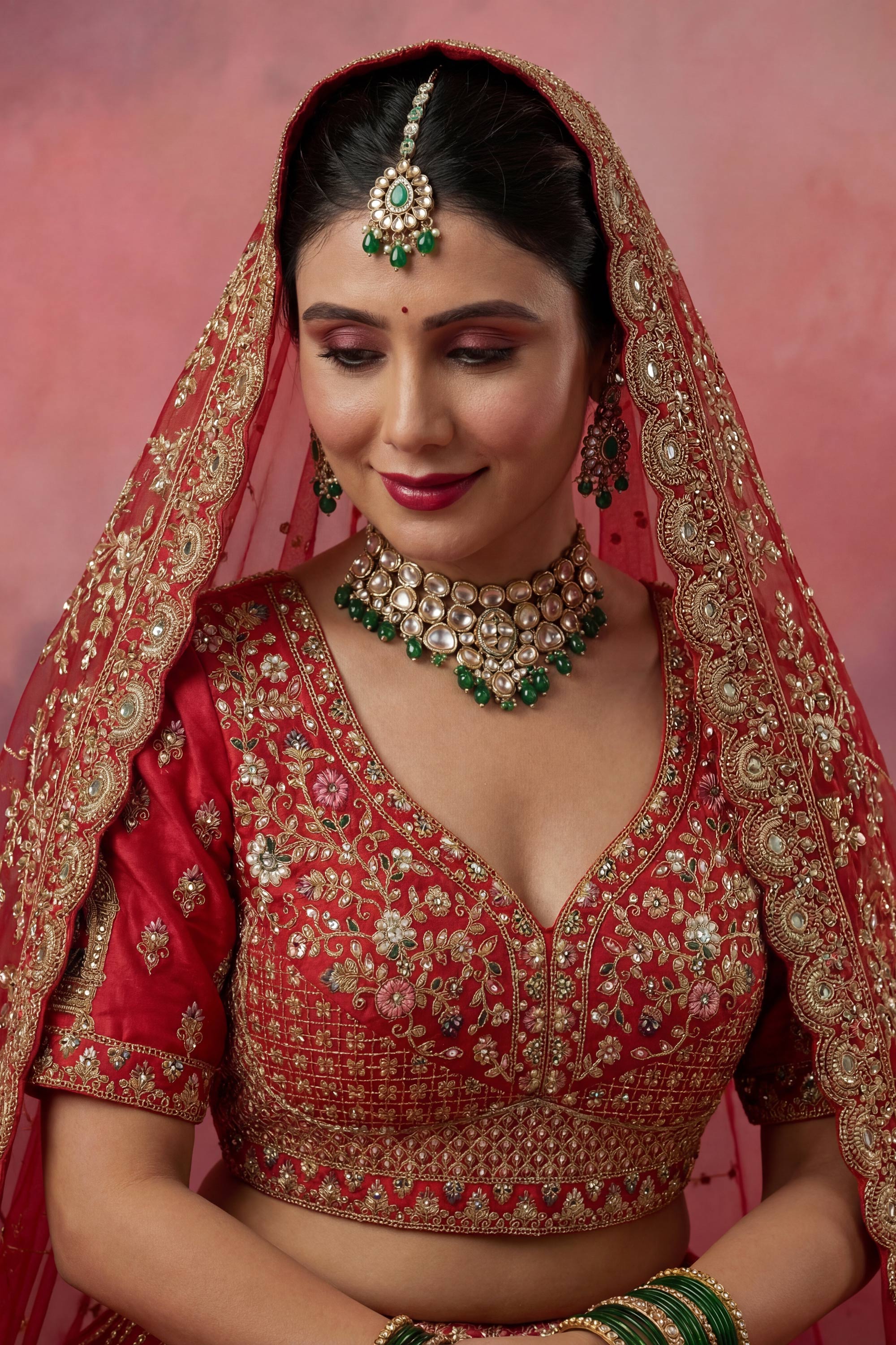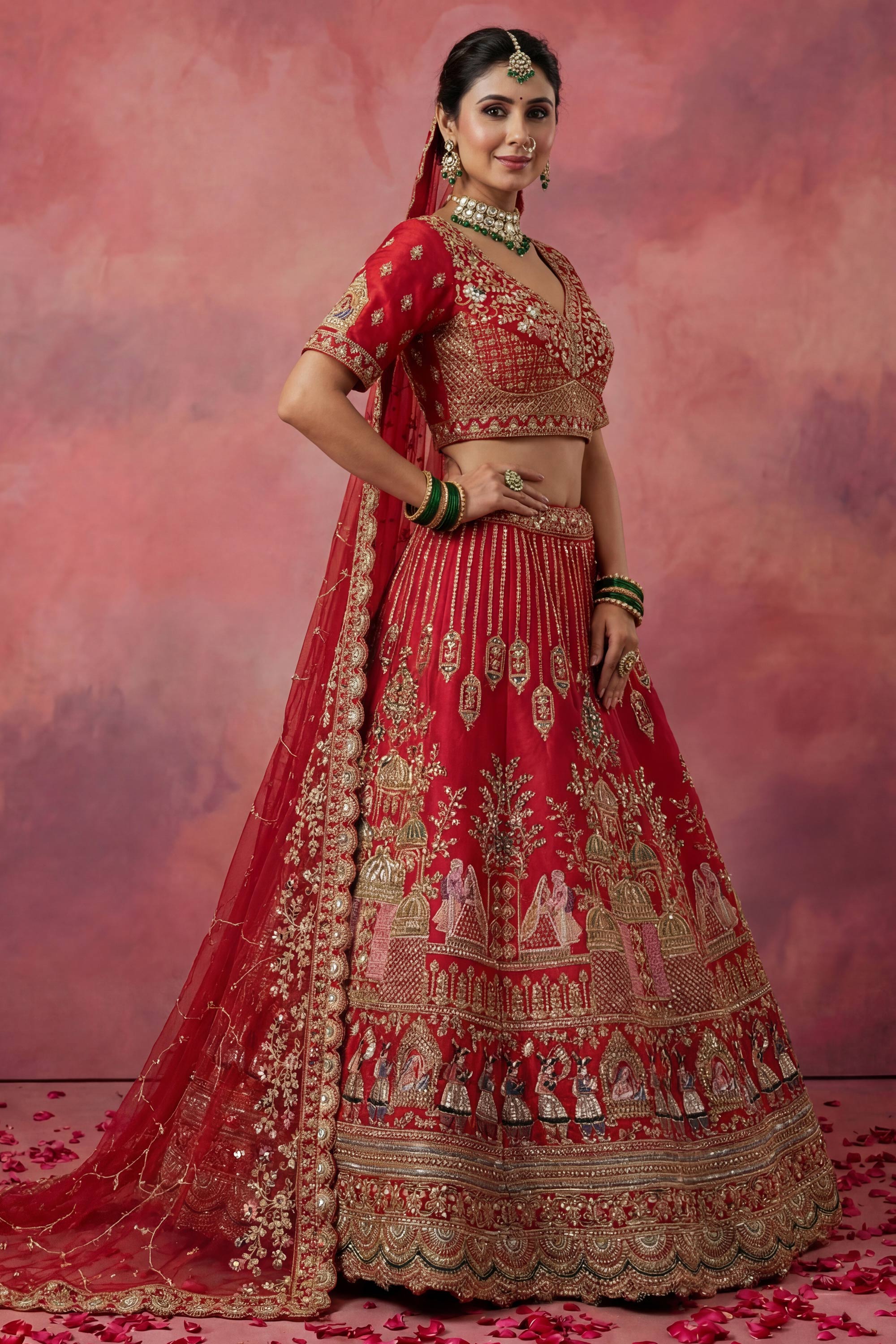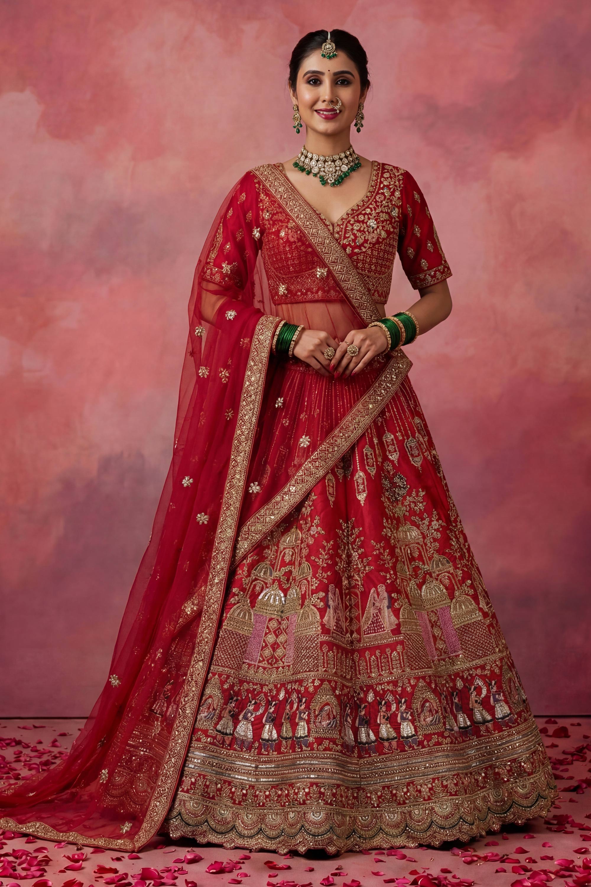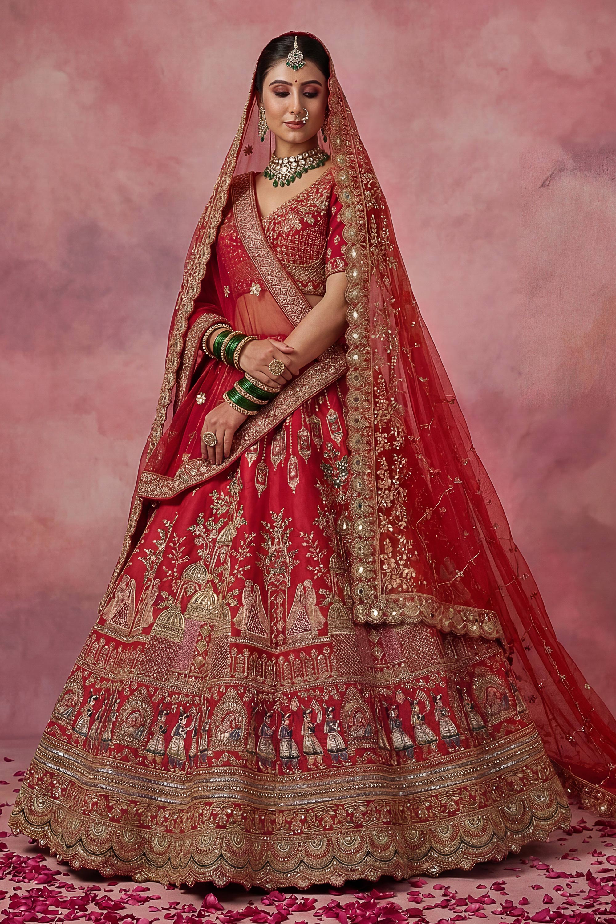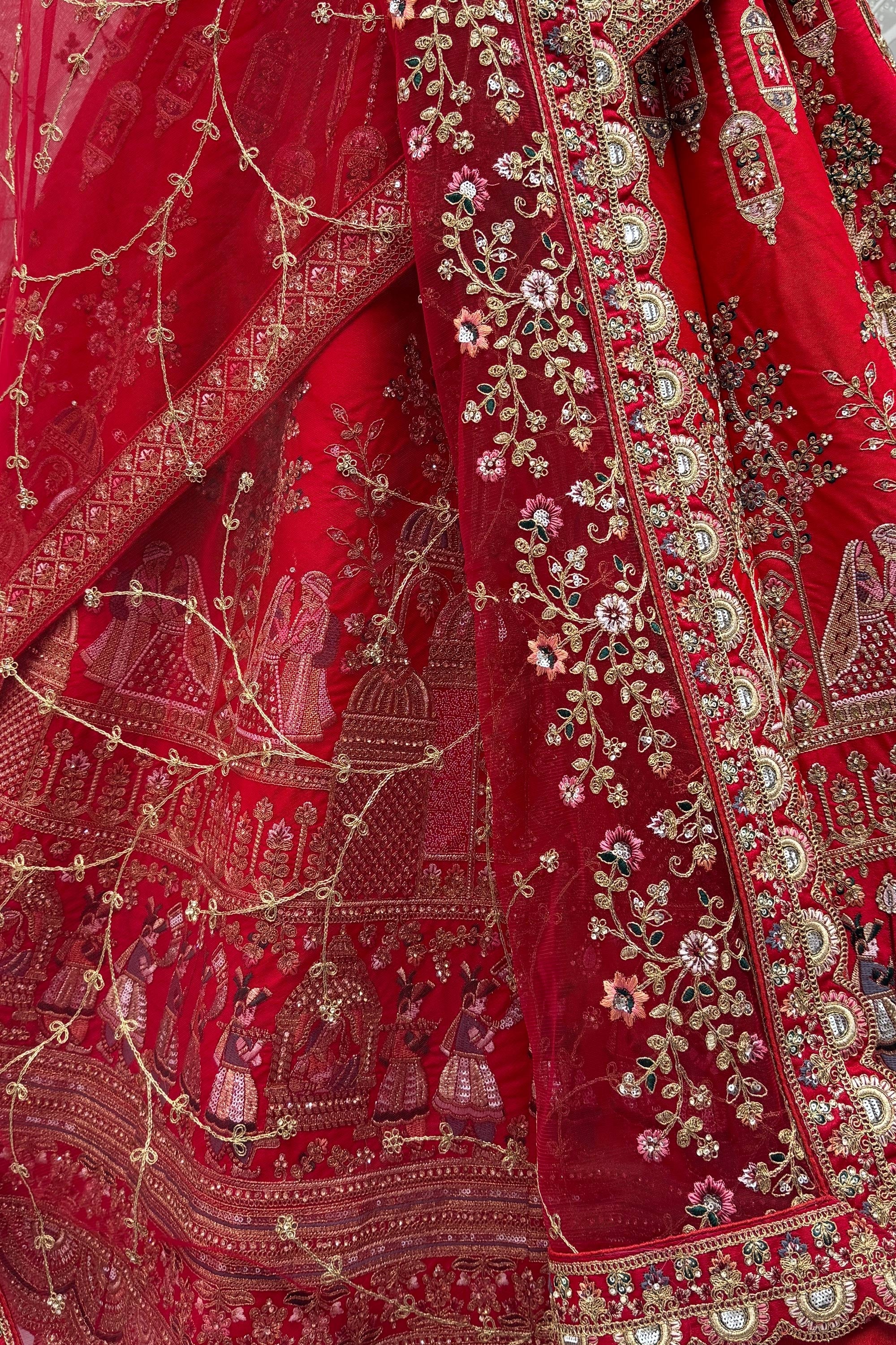 Graceful Heavy Embroidered Red Bridal Lehenga Choli In Silk Fabric