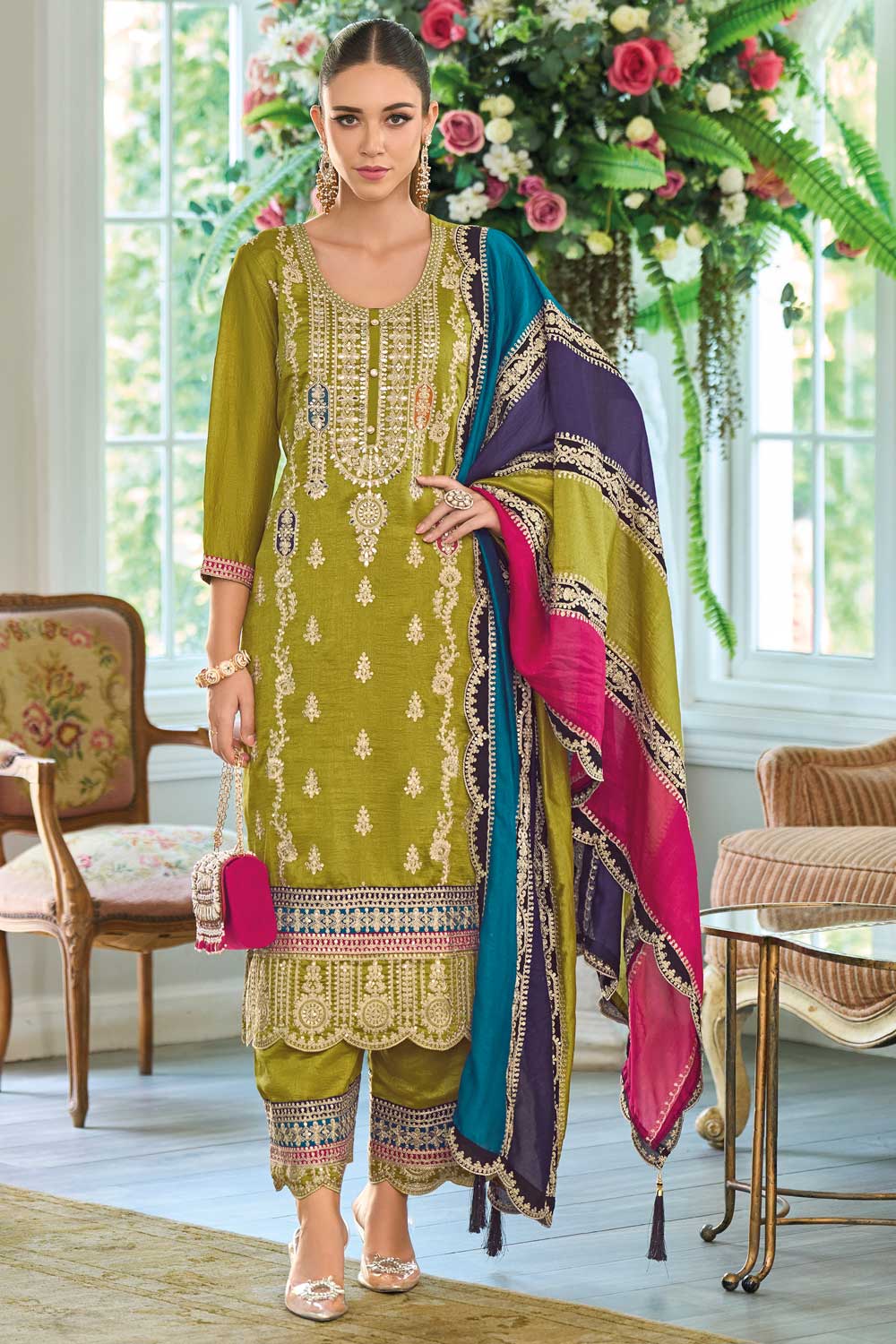 Green Color Chinon Fabric Special Readymade Palazzo Suit