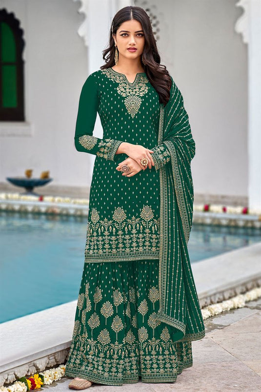 Green Color Embroidered Brilliant Georgette Fabric Palazzo Suit