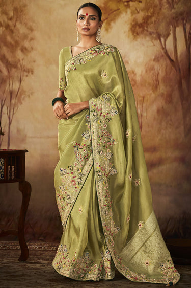 Green Color Gorgeous Embroidery Work Banarasi Kanjivaram Saree