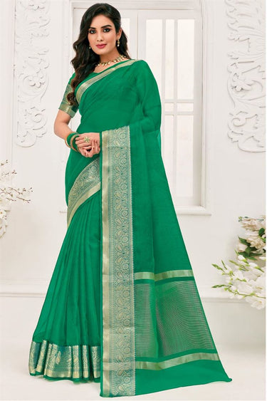 Green Color Intricate Weaving Border Work Casual Wear Saree In Organza Fabric