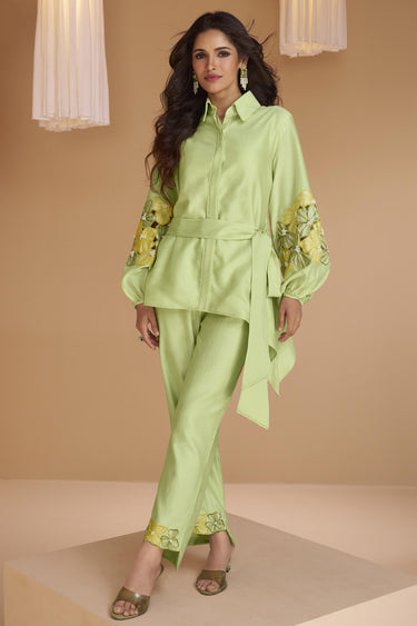 Green Color Party Wear Embroidered Art Silk Fabric Designer Readymade Co-Ord Set