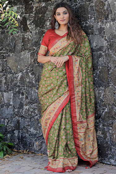 Revel in the charm of this Attractive Printed Patola Dola Silk Fabric Saree, an exquisite piece of Indian culture and tradition. The saree is woven from the luxurious Dola silk, renowned for its elegance and comfort. The same fine fabric has been used for the blouse piece as well, offering a seamless aesthetic. Please note that this saree comes un-stitched, enabling you to tailor it to your personal style and fit. A gentle reminder: digital photography may subtly alter the color variations. Regardless, the allure of this beautiful silk saree remains unscathed.
