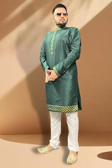 Green Color Reception Wear Readymade Silk Fabric Kurta Pyjama For Men
