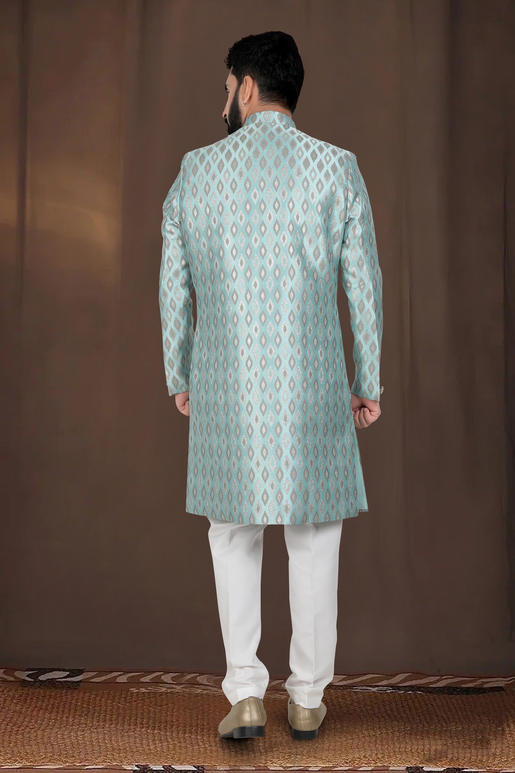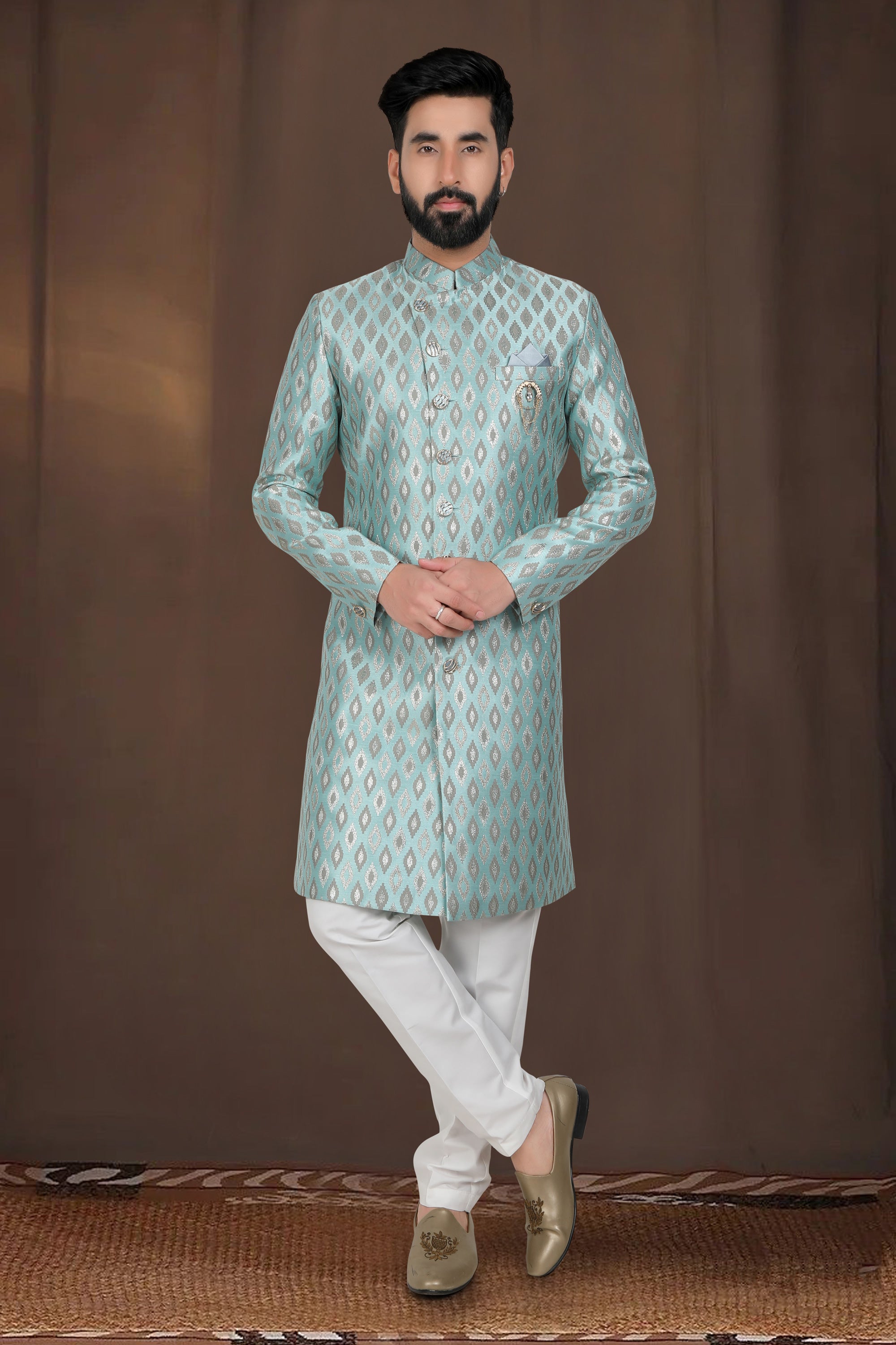 Green Gorgeous Jacquard Wedding Wear Readymade Indo Western For Men