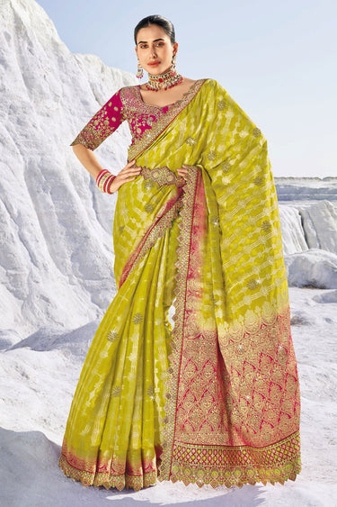 Step into sophistication with the Reach Color Georgette Fabric Zari Weaving Wedding Wear Saree with Heavy Embroidered Blouse. This stunning saree is crafted from premium Georgette fabric, known for its soft, flowing drape that beautifully complements its intricate detailing, making it ideal for wedding and festive wear.The saree’s highlight is its exquisite Zari weaving. Each thread of the Zari work is woven meticulously, creating an elegant shimmer that enhances the saree’s appeal. The delicate patterns of the Zari weave are designed to reflect light and bring out a subtle, luxurious glow, perfect for capturing the spotlight at any grand event.Accompanying this beautiful saree is an unstitched heavy embroidered silk blouse. The silk fabric adds richness to the overall ensemble, while the elaborate embroidery work creates a harmonious blend of traditional artistry and modern style. Since the blouse is unstitched, it can be customized to fit and tailored to match your unique preferences, adding a personal touh to this designer outfit.Please Note: Due to digital photography, there may be slight variations in color. The blouse and accessories shown in images are for styling purposes only, with the same blouse design available for you to tailor.This wedding wear saree offers a perfect fusion of traditional elegance and contemporary sophistication. With its striking Zari weaving and luxurious blouse, it’s the ideal choice for making a memorable impression on your special day.