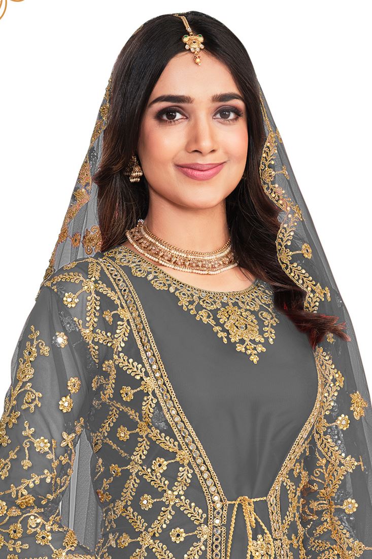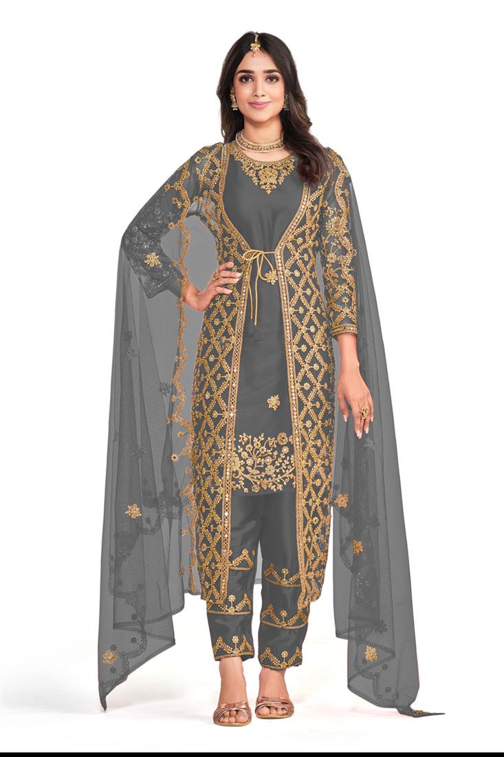 Grey Color Net Fabric Princely Salwar Suit With Koti